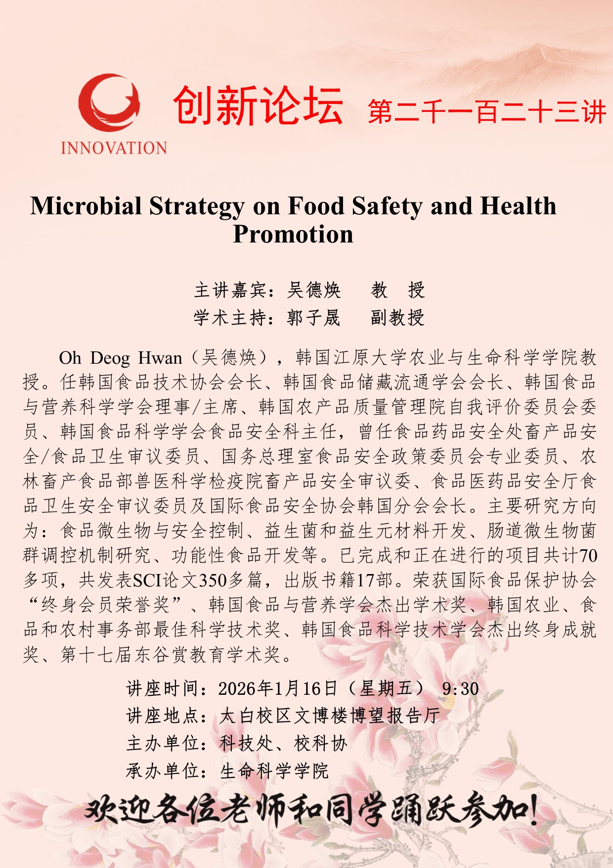 吴德焕 教授 伟德国际1949始于英国创新论坛第二千一百二十三讲:Microbial Strategy on Food Safety and Health Promotion 讲座时间 2026年1月16日(星期五)9:30 讲座地点 太白校区文博楼博望报告厅 讲座人介绍 吴德焕 教授 讲座内容