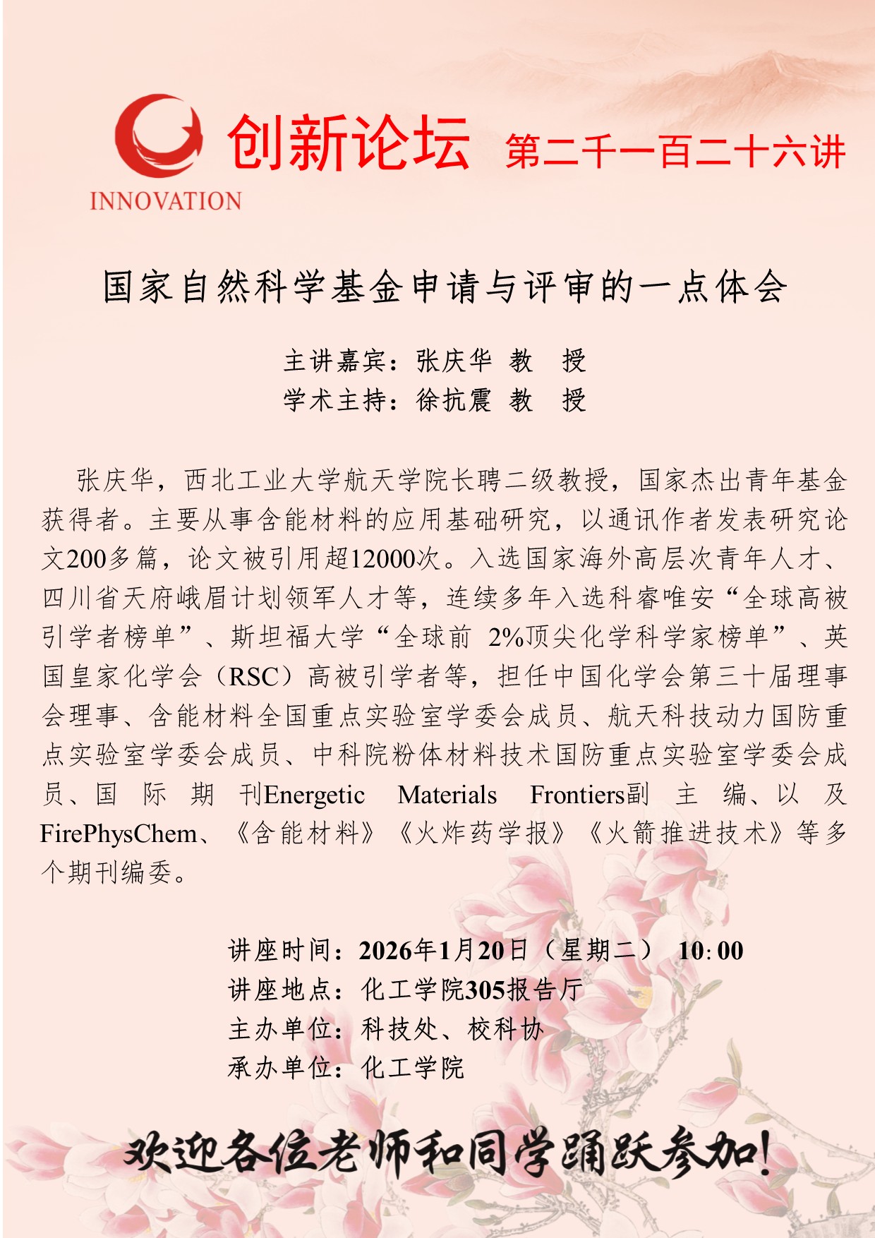 张庆华 教授 伟德国际1949始于英国创新论坛第二千一百二十六讲:国家自然科学基金申请与评审的一点体会 讲座时间 2026年1月20日(星期二) 10:00 讲座地点 化工学院305报告厅 讲座人介绍 张庆华 教授 讲座内容