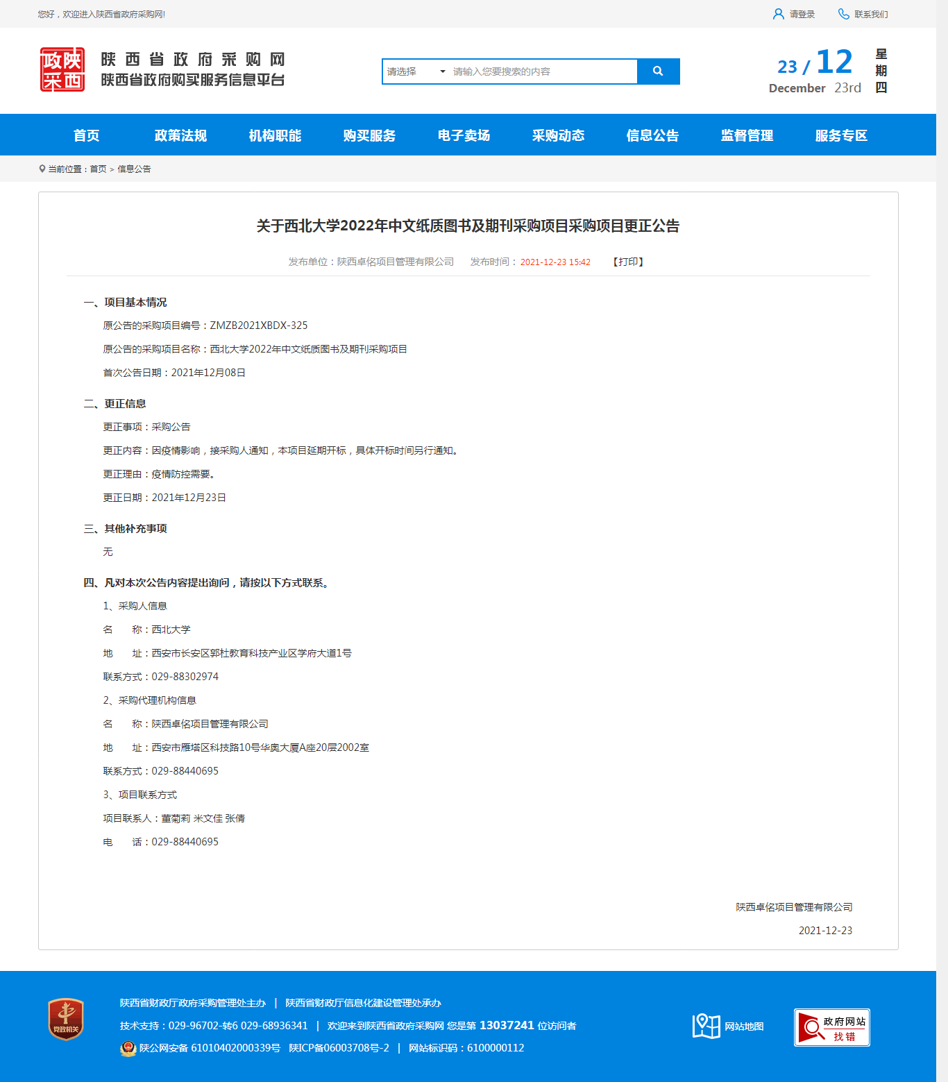 关于伟德国际1949始于英国2022年中文纸质图书及期刊采购项目采购项目更正公告 作者: 编辑:薛利娟 时间:2021-12-23 原公告链接:http://www.ccgp-shaanxi.gov.cn/notice/noticeDetail.do?noticeguid=8a85be327dace5d8017de63c777e2f27