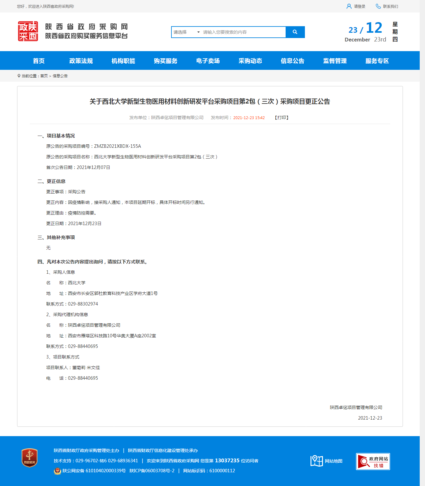 关于伟德国际1949始于英国新型生物医用材料创新研发平台采购项目第2包(三次)采购项目更正公告 作者: 编辑:薛利娟 时间:2021-12-23 原公告链接:http://www.ccgp-shaanxi.gov.cn/notice/noticeDetail.do?noticeguid=8a85be327dace5d8017de63b467e2efd