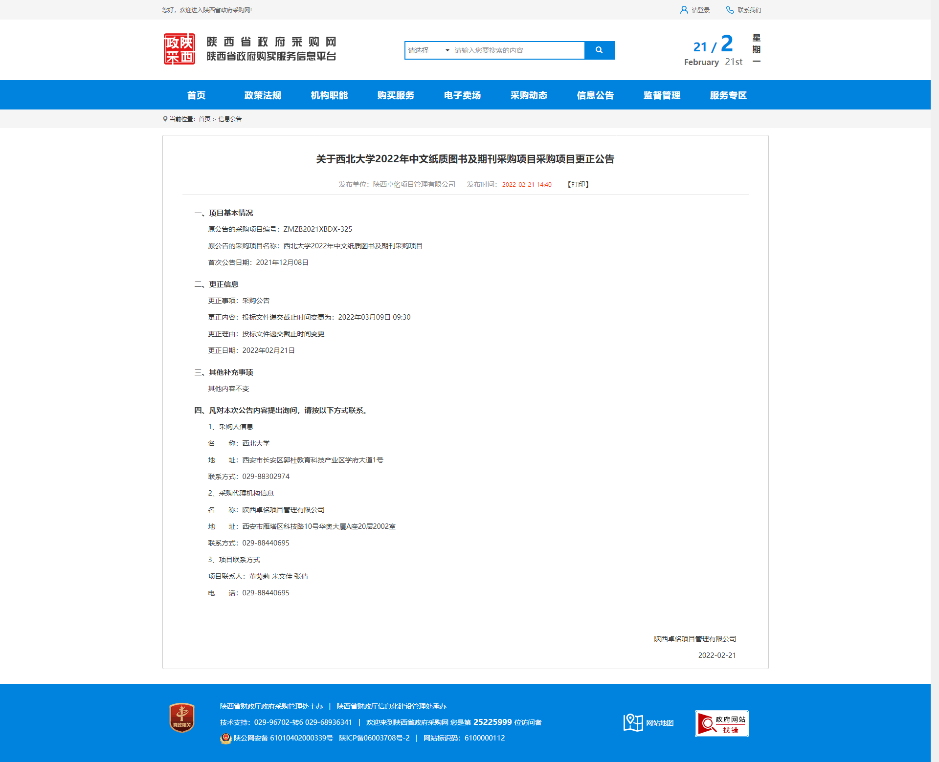 关于伟德国际1949始于英国2022年中文纸质图书及期刊采购项目采购项目更正公告 作者: 编辑:薛利娟 时间:2022-02-21 原公告地址:http://www.ccgp-shaanxi.gov.cn/notice/noticeDetail.do?noticeguid=8a85be317ee7907d017f1aa113f346e8