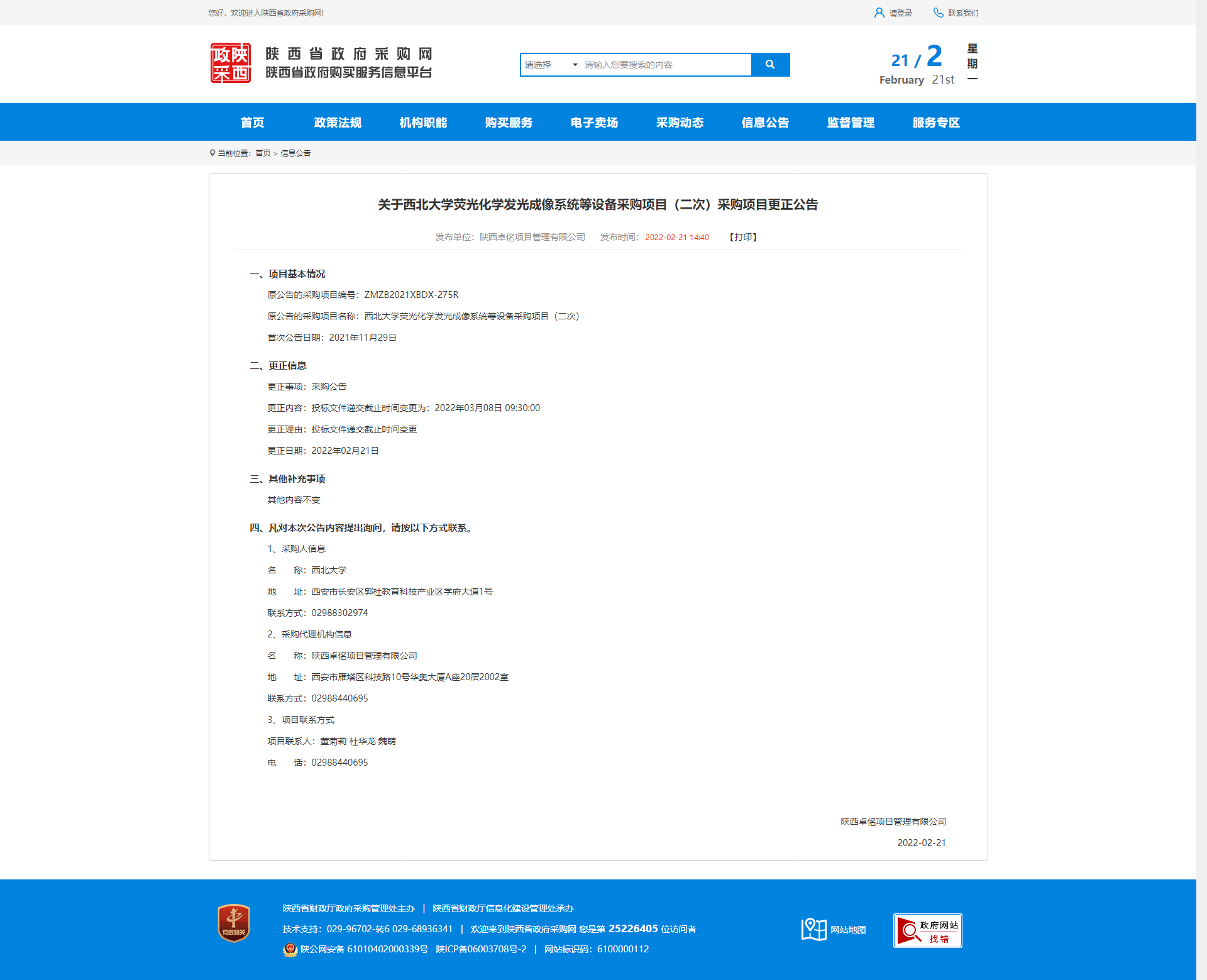 关于伟德国际1949始于英国荧光化学发光成像系统等设备采购项目(二次)采购项目更正公告 作者: 编辑:薛利娟 时间:2022-02-21 原公告链接:http://www.ccgp-shaanxi.gov.cn/notice/noticeDetail.do?noticeguid=8a85be317ee7907d017f1aa113f346e8
