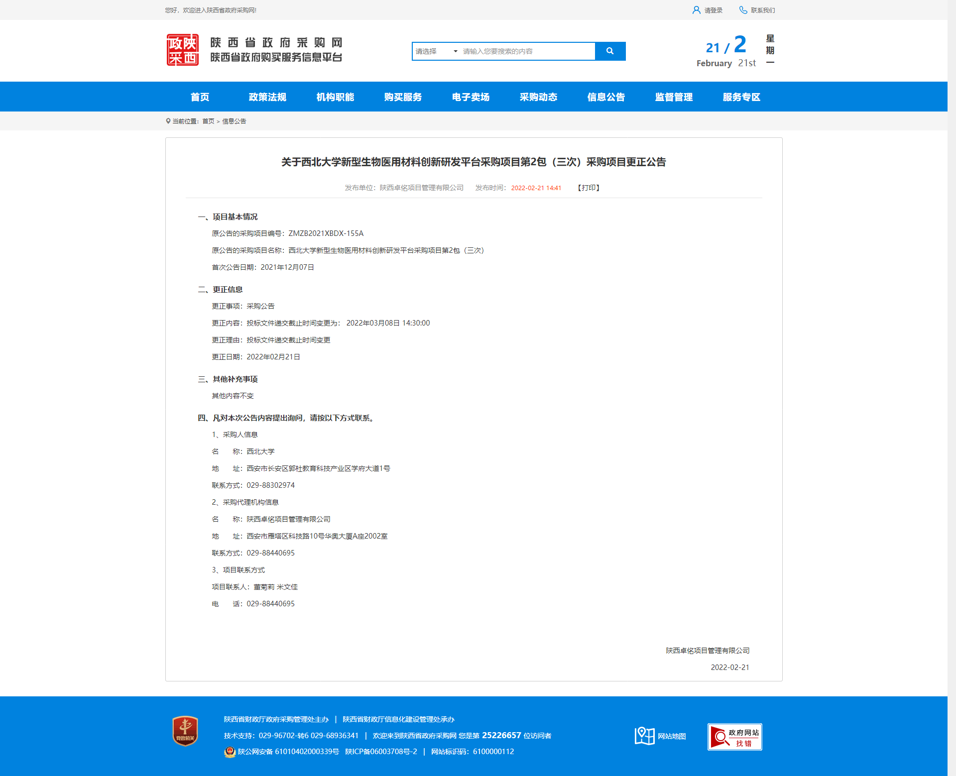 关于伟德国际1949始于英国新型生物医用材料创新研发平台采购项目第2包(三次)采购项目更正公告 作者: 编辑:薛利娟 时间:2022-02-21 原公告链接:http://www.ccgp-shaanxi.gov.cn/notice/noticeDetail.do?noticeguid=8a85be317ee7907d017f1a9fc1d146e6
