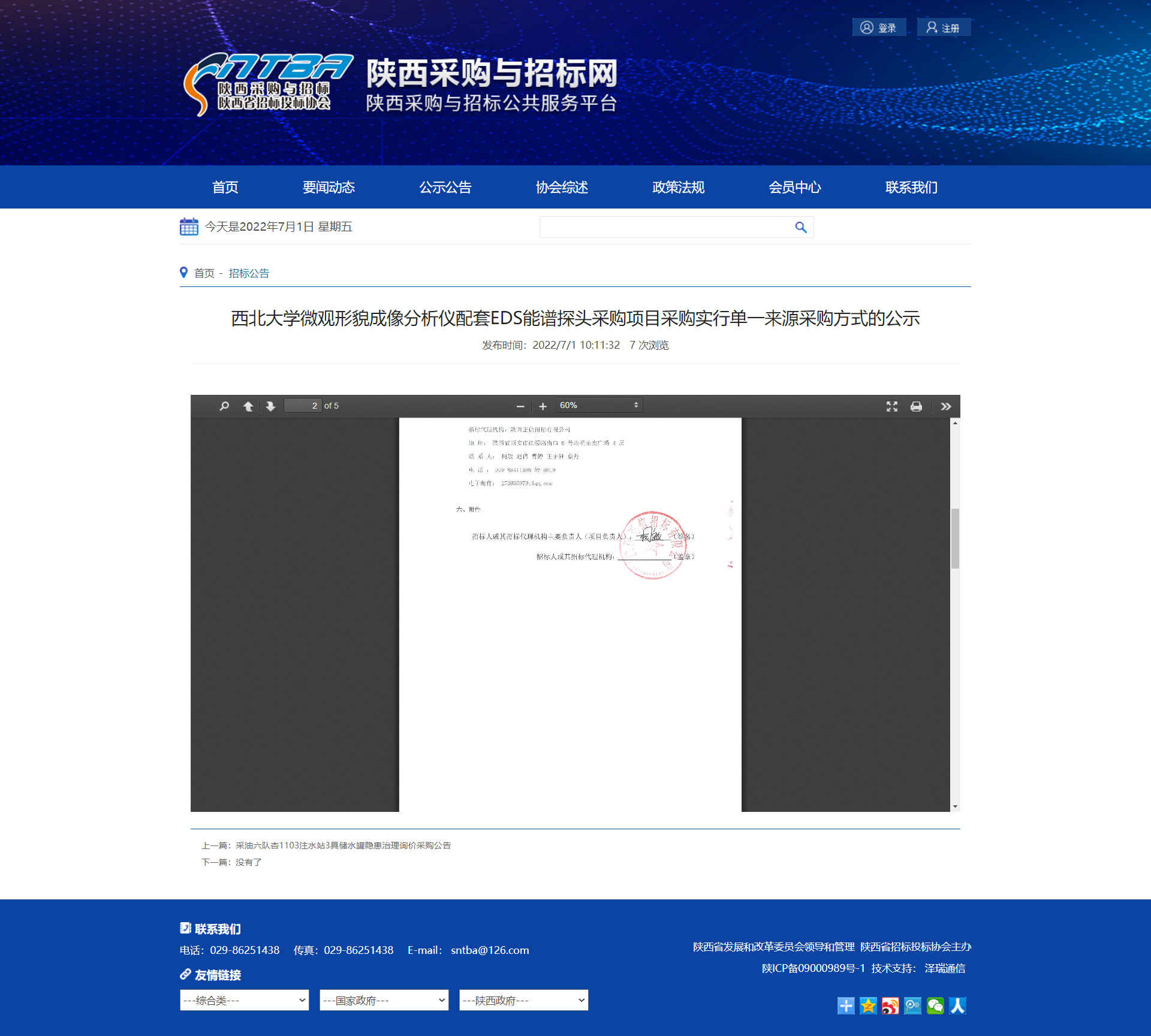 伟德国际1949始于英国微观形貌成像分析仪配套EDS能谱探头采购项目采购实行单一来源采购方式的公示 作者: 编辑:采购与招标办公室 时间:2022-07-01 原公告链接:http://www.sntba.com/website/gg_show.aspx?id=216192