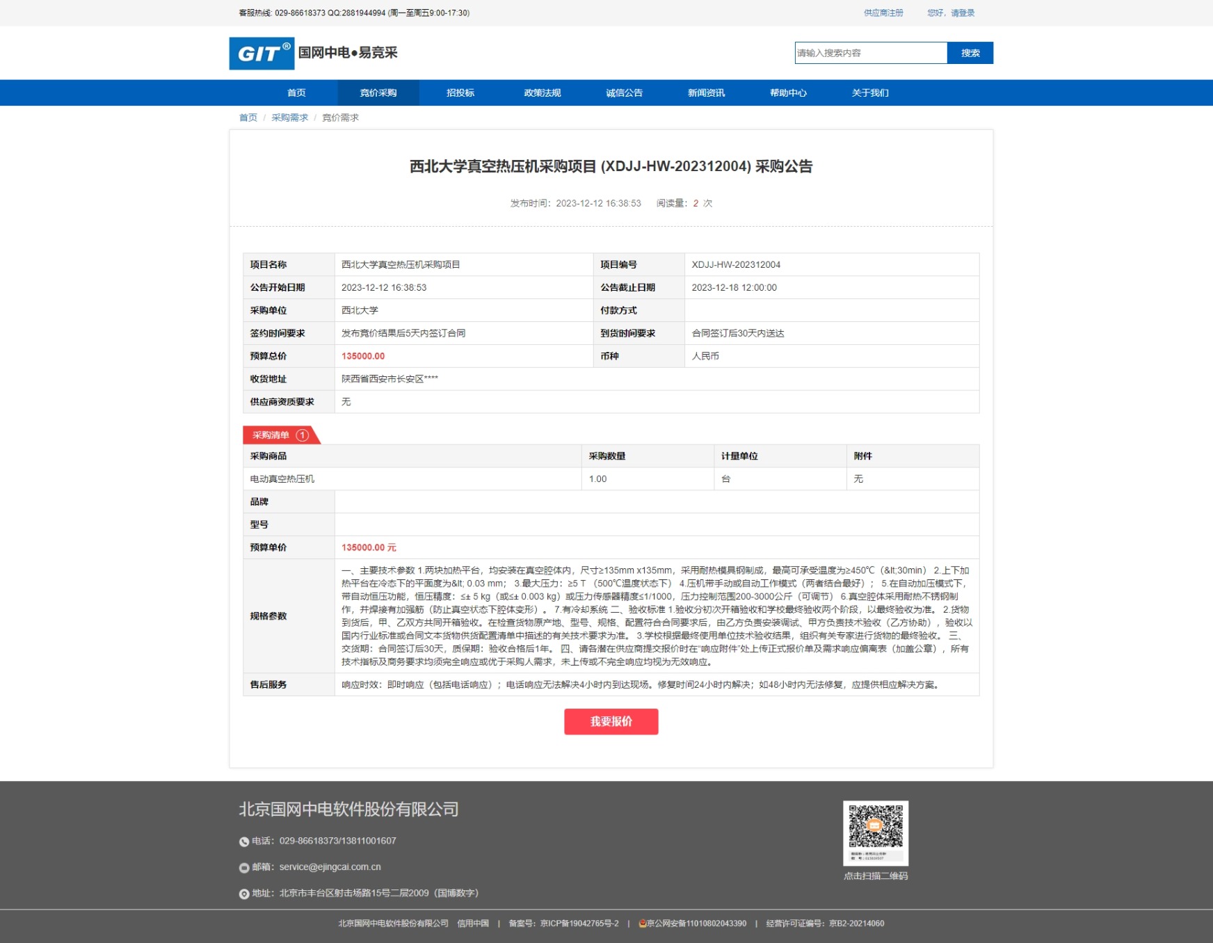 伟德国际1949始于英国真空热压机采购项目 (XDJJ-HW-202312004) 采购公告 作者: 编辑:采购与招标办公室 时间:2023-12-12 原公告链接:https://www.ejingcai.com.cn/site/bidding/detail/7765
