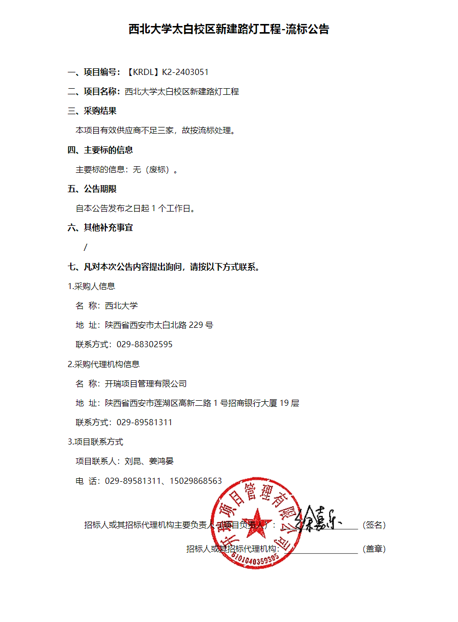 伟德国际1949始于英国太白校区新建路灯工程流标公告