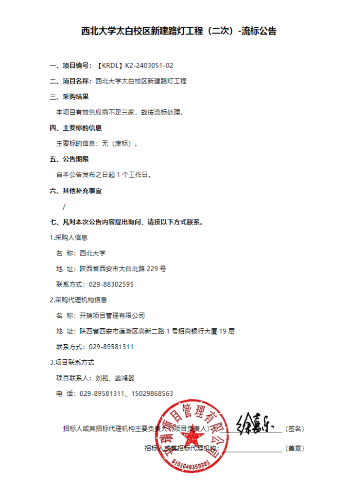伟德国际1949始于英国太白校区新建路灯工程(二次)-流标公告