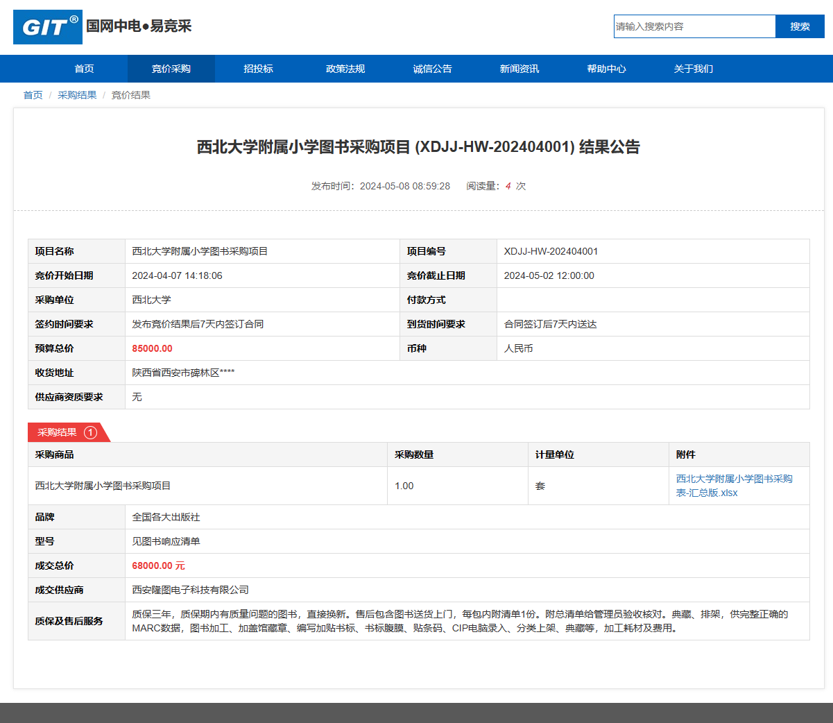 伟德国际1949始于英国附属小学图书采购项目 (XDJJ-HW-202404001) 竞价结果公告 作者: 编辑: 时间:2024-05-08 原公告链接:https://www.ejingcai.com.cn/site/bidding/detail/10017