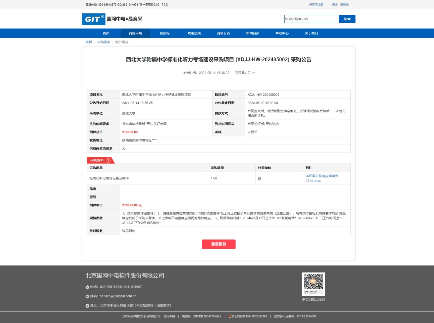 伟德国际1949始于英国附属中学标准化听力考场建设采购项目 (XDJJ-HW-202405002) 竞价采购公告 作者: 编辑:采购与招标办公室 时间:2024-05-14 原公告链接:https://www.ejingcai.com.cn/site/bidding/detail/10191