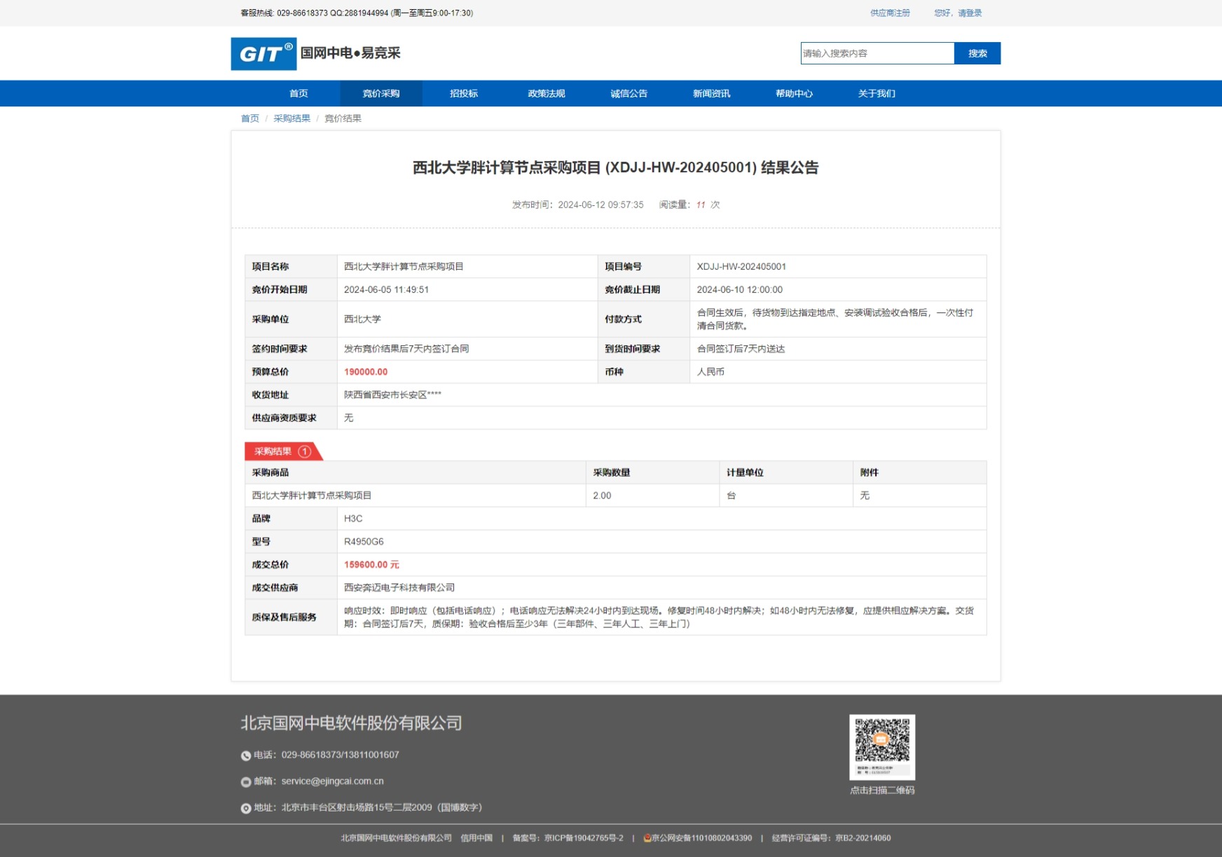 伟德国际1949始于英国胖计算节点采购项目 (XDJJ-HW-202405001)竞价结果公告 作者: 编辑:采购与招标办公室 时间:2024-06-12 原公告链接:https://www.ejingcai.com.cn/site/bidding/detail/10930