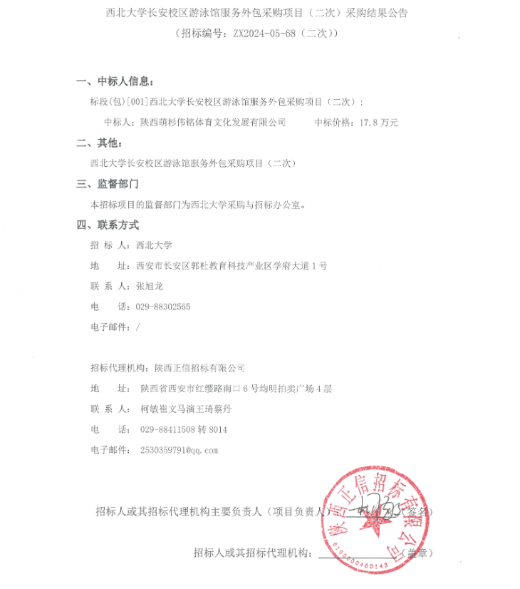 伟德国际1949始于英国长安校区游泳馆服务外包采购项目(二次)采购结果公告