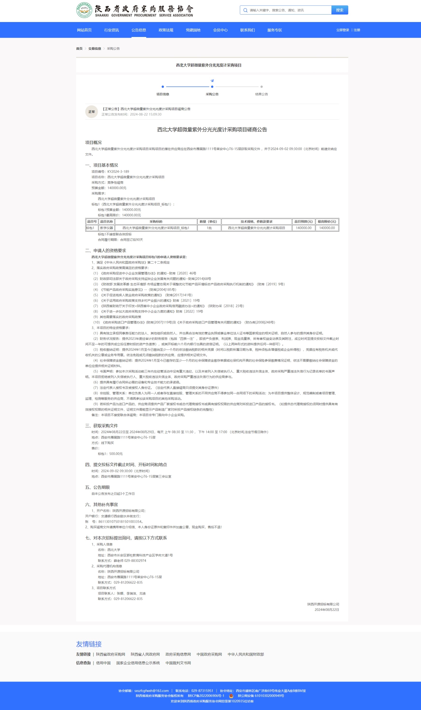 伟德国际1949始于英国超微量紫外分光光度计采购项目磋商公告 作者: 编辑:采购与招标办公室 时间:2024-08-23 原公告链接:https://www.sxszfcgfwxh.cn/#/tender-vTradeAnnouncement-anno?tenderProjectId=1826435442958446594&rootId=1549250743389216770