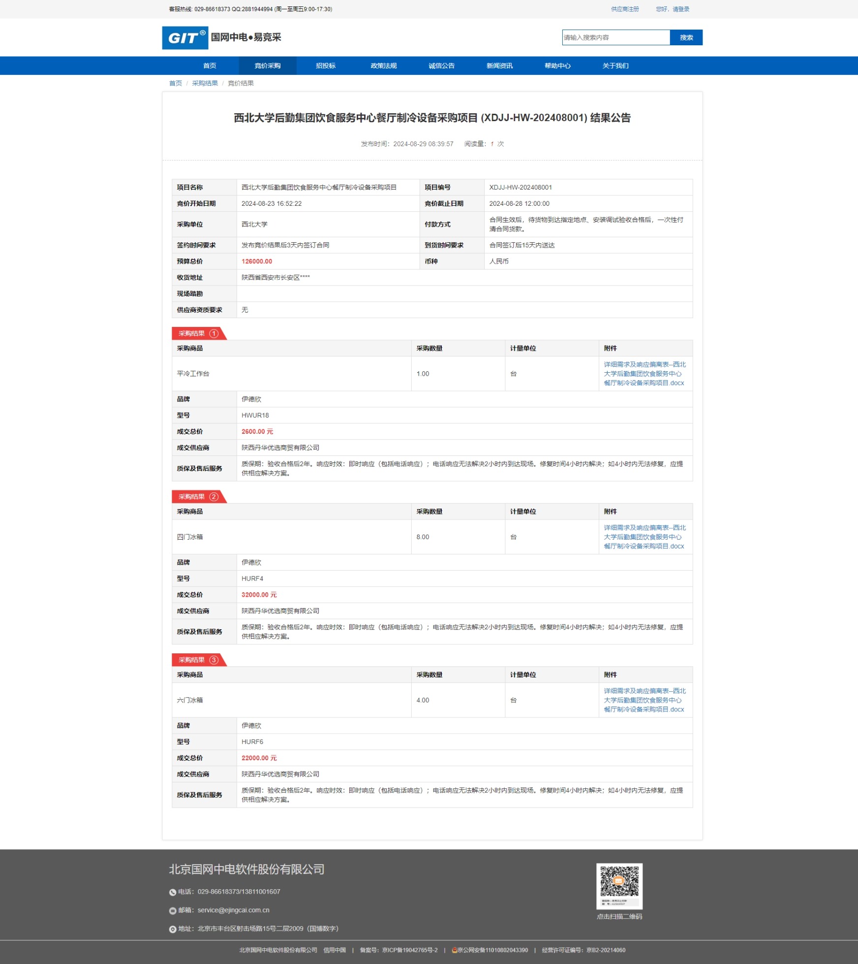 伟德国际1949始于英国后勤集团饮食服务中心餐厅制冷设备采购项目 (XDJJ-HW-202408001) 竞价结果公告 作者: 编辑:采购与招标办公室 时间:2024-08-29 原公告链接:https://www.ejingcai.com.cn/site/bidding/detail/12245