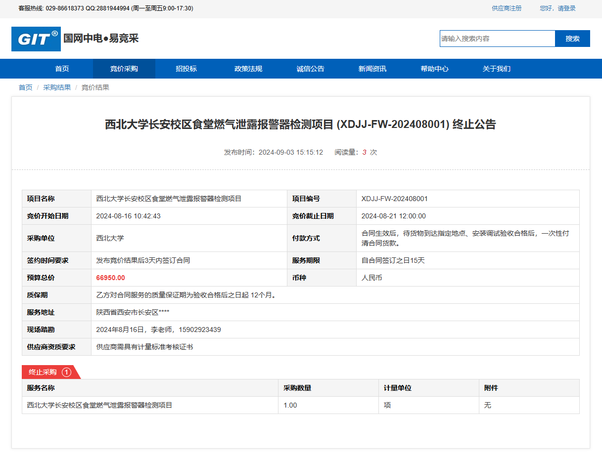 伟德国际1949始于英国长安校区食堂燃气泄露报警器检测项目 (XDJJ-FW-202408001) 竞价终止公告 作者: 编辑: 时间:2024-09-03 原公告链接:https://www.ejingcai.com.cn/site/bidding/detail/12307