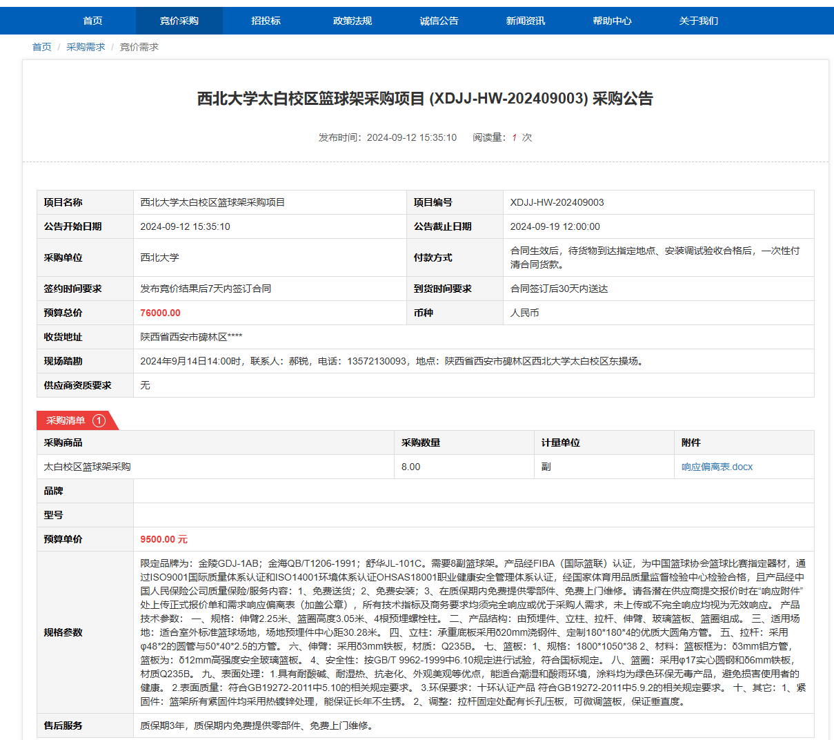 伟德国际1949始于英国太白校区篮球架采购项目 (XDJJ-HW-202409003)竞价采购公告 作者: 编辑: 时间:2024-09-12 原公告链接:https://www.ejingcai.com.cn/site/bidding/detail/12528
