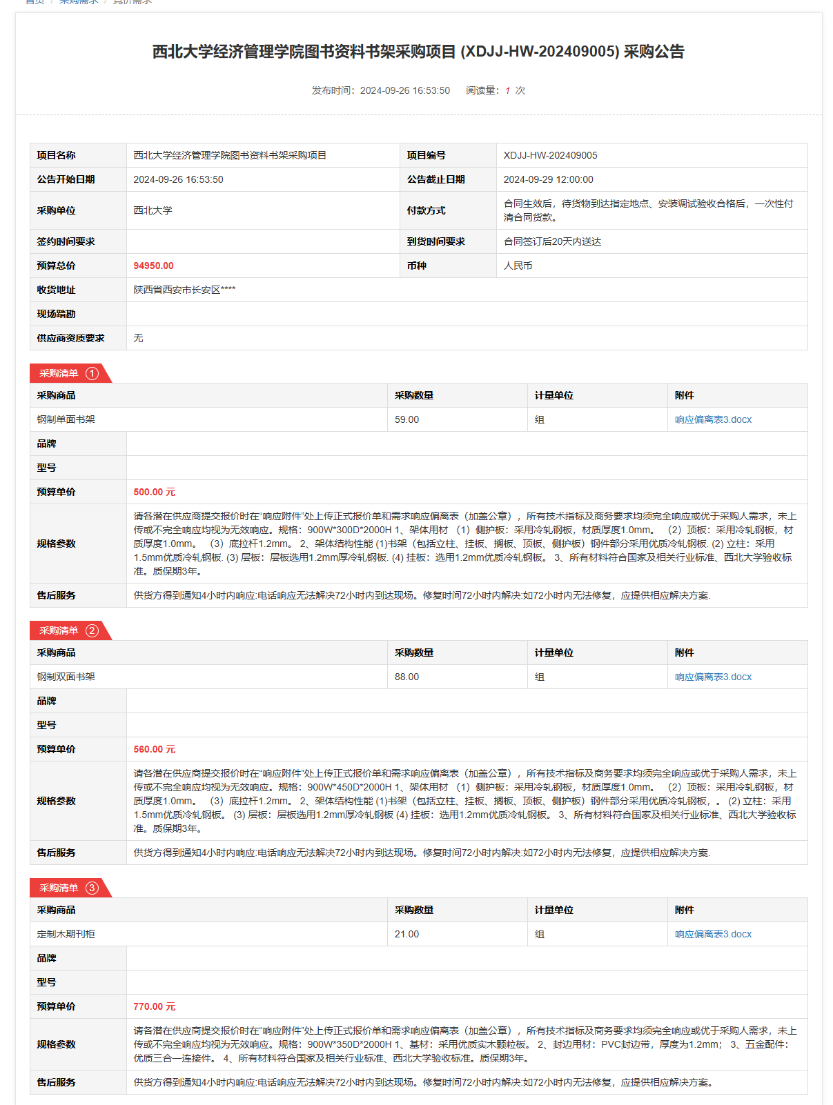 伟德国际1949始于英国经济管理学院图书资料书架采购项目(XDJJ-HW-202409005)竞价采购公告 作者: 编辑: 时间:2024-09-26 原公告链接:https://www.ejingcai.com.cn/site/bidding/detail/12910