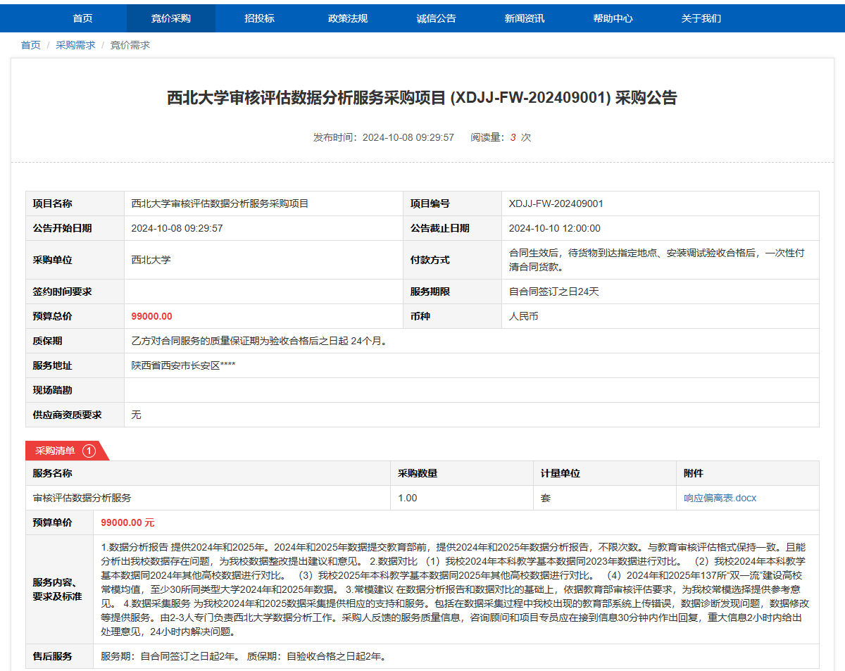 伟德国际1949始于英国审核评估数据分析服务采购项目(XDJJ-FW-202409001)竞价采购公告 作者: 编辑: 时间:2024-10-08 原公告链接:https://www.ejingcai.com.cn/site/bidding/detail/13071