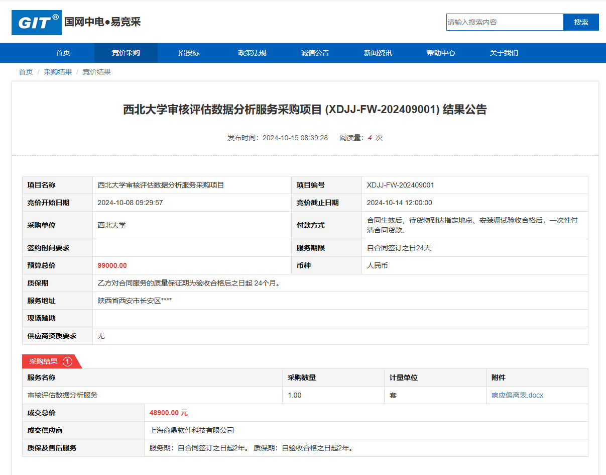 伟德国际1949始于英国审核评估数据分析服务采购项目(XDJJ-FW-202409001)竞价结果公告 作者:采购与招标办公室 编辑: 时间:2024-10-15 原公告链接:https://www.ejingcai.com.cn/site/bidding/detail/13296