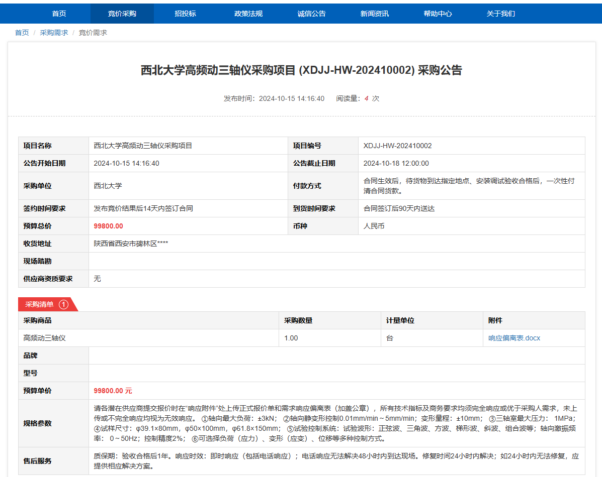 伟德国际1949始于英国高频动三轴仪采购项目(XDJJ-HW-202410002)竞价采购公告 作者:采购与招标办公室 编辑: 时间:2024-10-15 原公告链接:https://www.ejingcai.com.cn/site/bidding/detail/13317