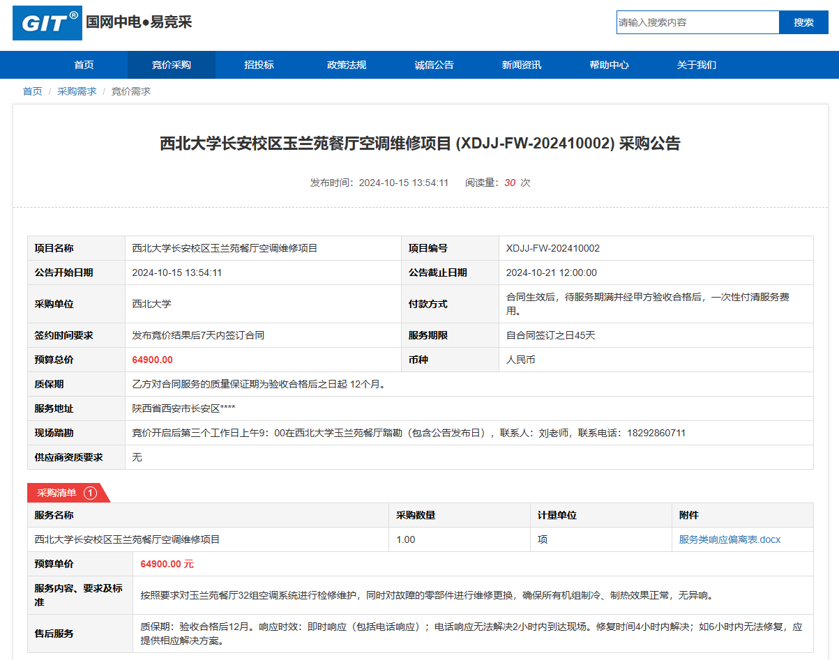 伟德国际1949始于英国长安校区玉兰苑餐厅空调维修项目(XDJJ-FW-202410002)竞价采购公告 作者:采购与招标办公室 编辑: 时间:2024-10-15 原公告链接:https://www.ejingcai.com.cn/site/bidding/detail/13316