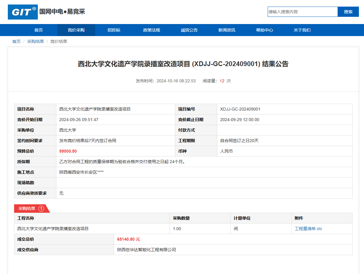 伟德国际1949始于英国文化遗产学院录播室改造项目(XDJJ-GC-202409001)竞价结果公告 作者:采购与招标办公室 编辑: 时间:2024-10-16 原公告链接:https://www.ejingcai.com.cn/site/bidding/detail/13343