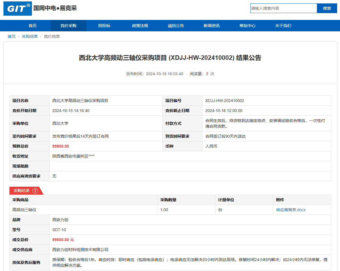 伟德国际1949始于英国高频动三轴仪采购项目(XDJJ-HW-202410002)竞价结果公告 作者:采购与招标办公室 编辑: 时间:2024-10-18 原公告链接:https://www.ejingcai.com.cn/site/bidding/detail/13488