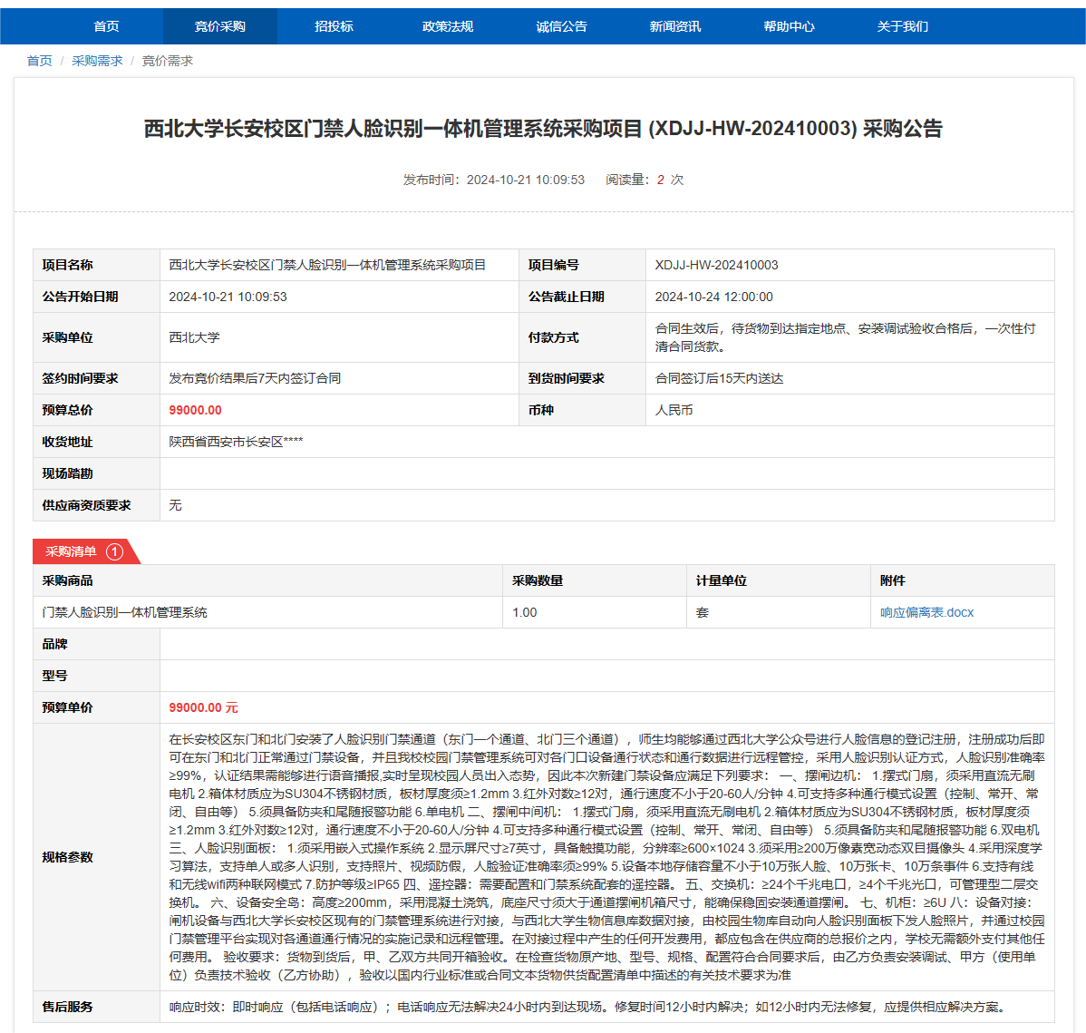 伟德国际1949始于英国长安校区门禁人脸识别一体机管理系统采购项目(XDJJ-HW-202410003)竞价采购公告 作者:采购与招标办公室 编辑: 时间:2024-10-21 原公告链接:https://www.ejingcai.com.cn/site/bidding/detail/13531