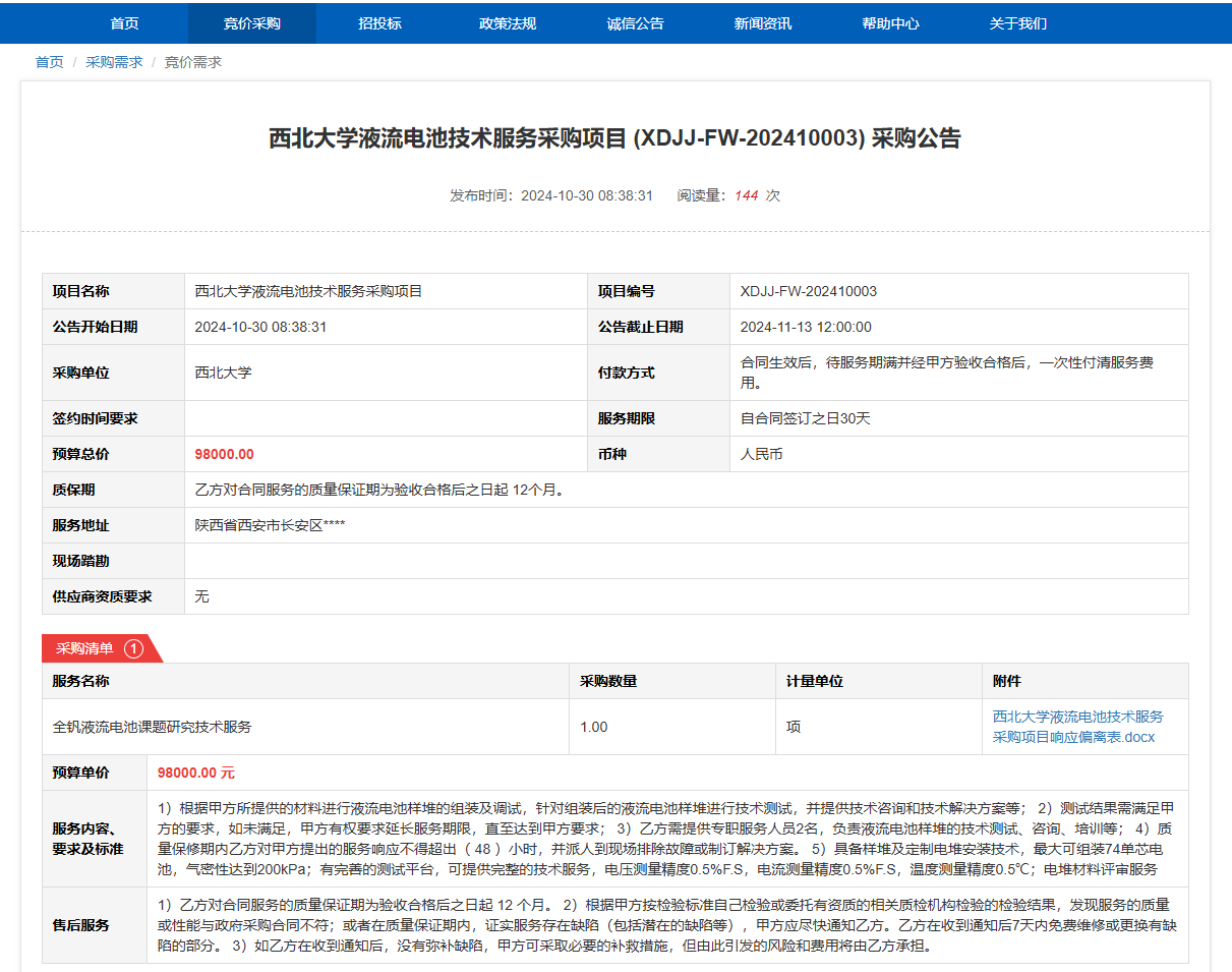 伟德国际1949始于英国液流电池技术服务采购项目(XDJJ-FW-202410003)竞价采购公告 作者:采购与招标办公室 编辑: 时间:2024-10-30 原公告链接:https://www.ejingcai.com.cn/site/bidding/detail/14096
