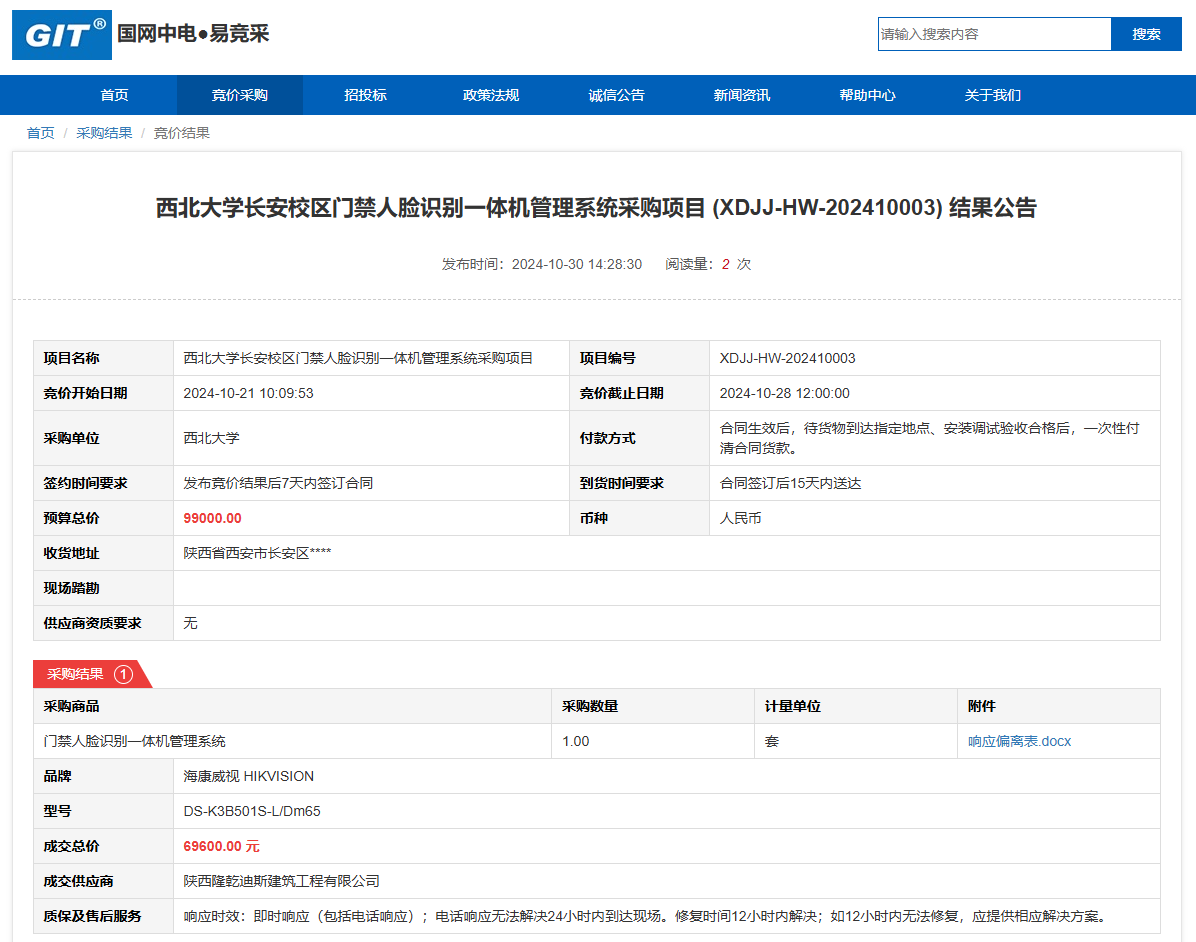 伟德国际1949始于英国长安校区门禁人脸识别一体机管理系统采购项目(XDJJ-HW-202410003)竞价结果公告 作者:采购与招标办公室 编辑: 时间:2024-10-30 原公告链接:https://www.ejingcai.com.cn/site/bidding/detail/14111