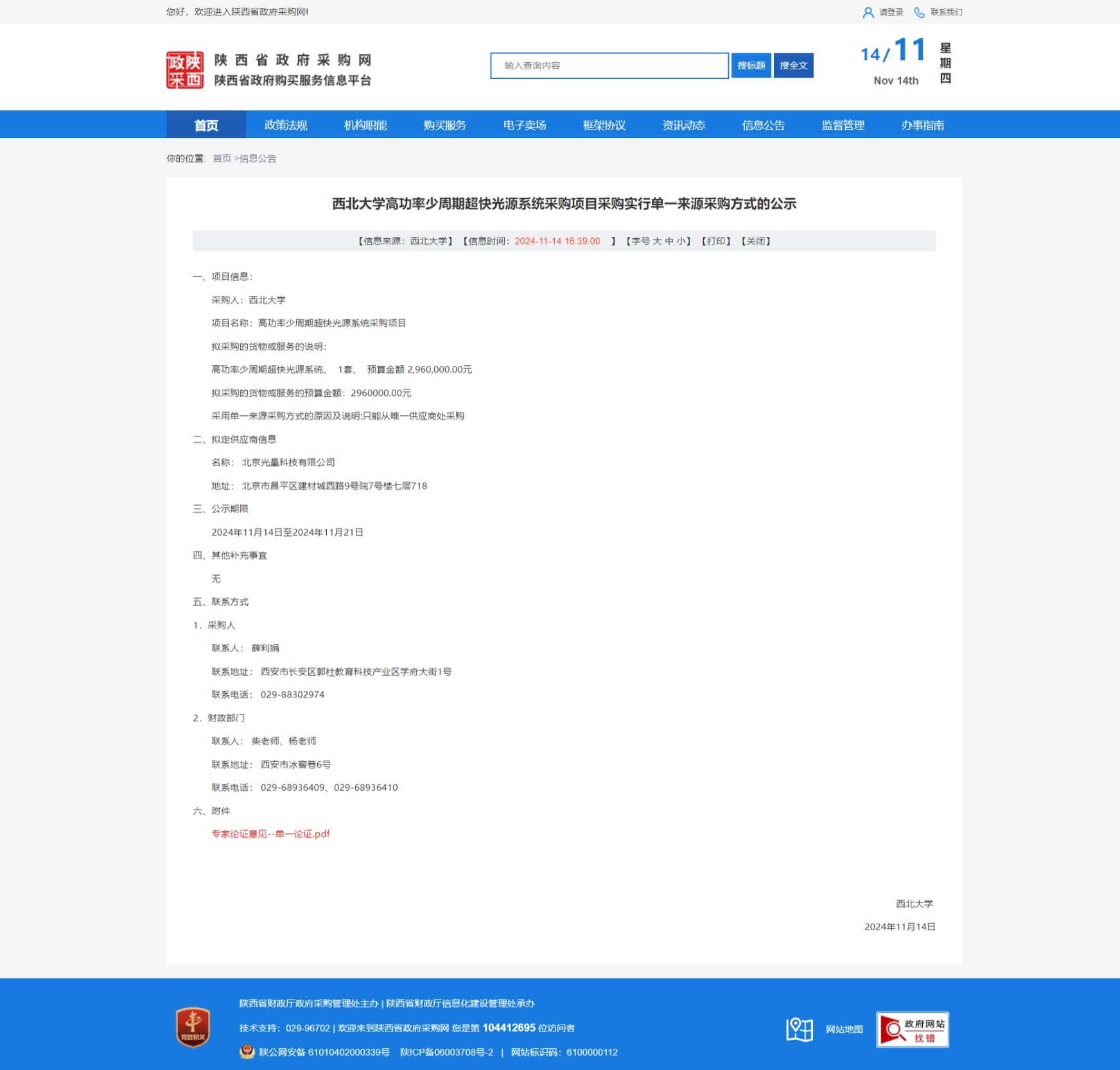伟德国际1949始于英国高功率少周期超快光源系统采购项目采购实行单一来源采购方式的公示 作者: 编辑:薛利娟 时间:2024-11-14 原公告链接:https://www.ccgp-shaanxi.gov.cn/freecms/site/shaanxi/ggxx/info/2024/8a69c4549327c24f019329cd909b47ff.html?noticeType=001051¬iceId=764b216e-a265-11ef-8063-08c0eb20c666