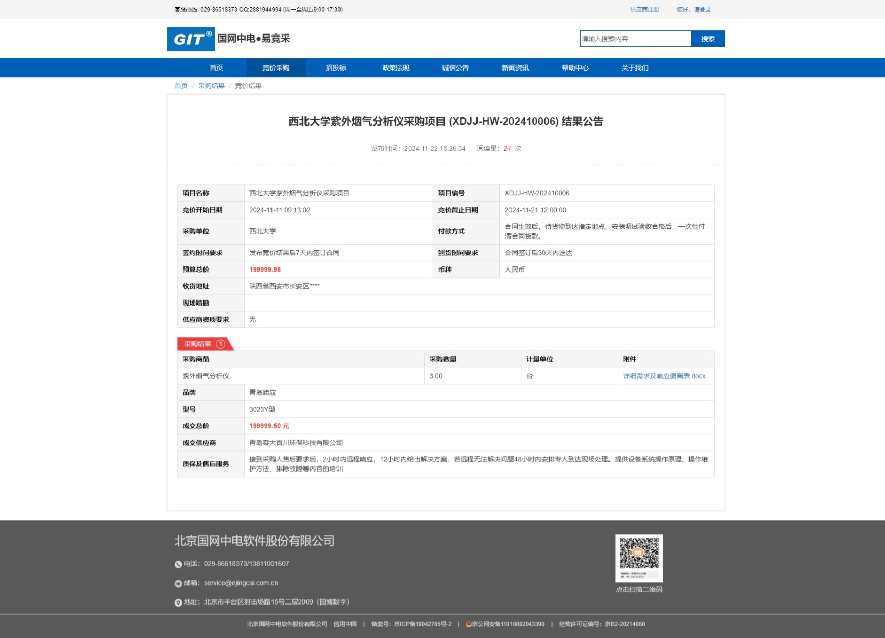 伟德国际1949始于英国紫外烟气分析仪采购项目 (XDJJ-HW-202410006) 结果公告 作者: 编辑:薛利娟 时间:2024-11-22 原公告链接:https://www.ejingcai.com.cn/site/bidding/detail/15251