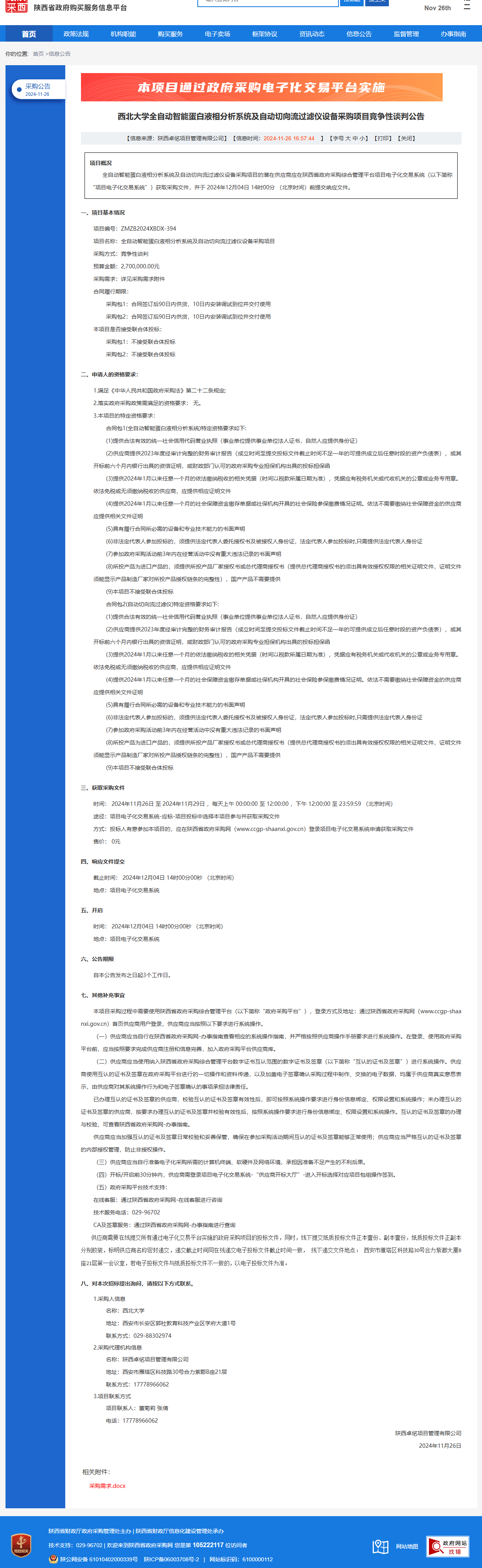 伟德国际1949始于英国全自动智能蛋白液相分析系统及自动切向流过滤仪设备采购项目竞争性谈判公告 作者:采购与招标办公室 编辑: 时间:2024-11-26 原公告链接:https://www.ccgp-shaanxi.gov.cn/freecms/site/shaanxi/ggxx/info/2024/8a69c5a59218576d01936775f5d97931.html?noticeType=001013¬iceId=17632152-abd6-11ef-8063-08c0eb20c666