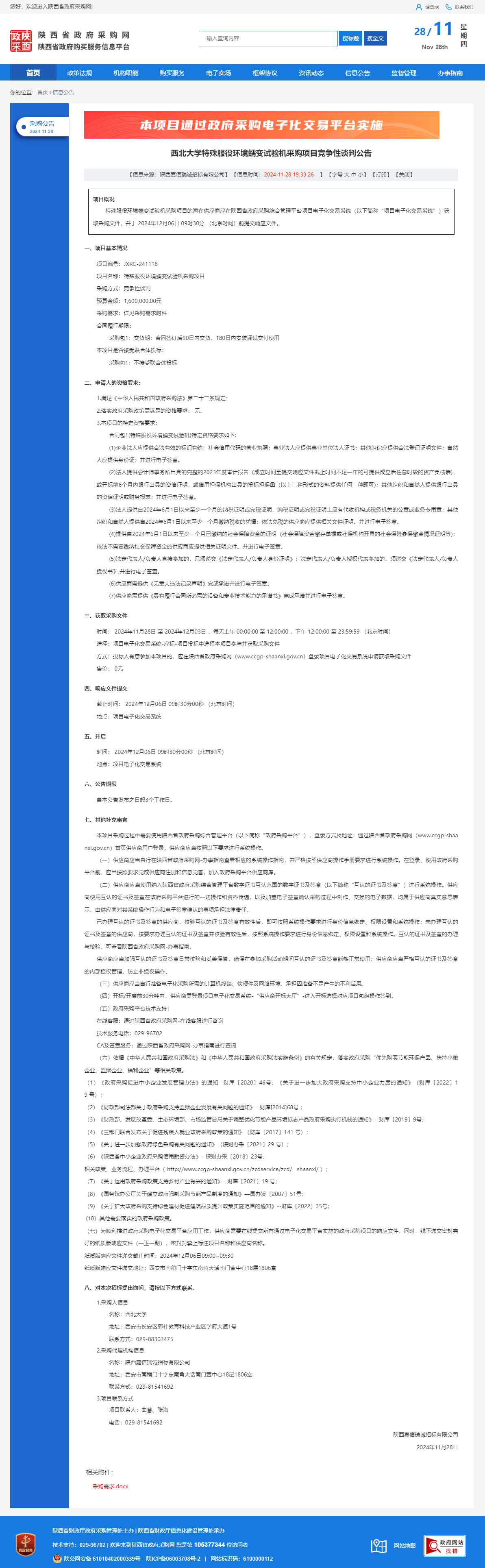 伟德国际1949始于英国特殊服役环境蠕变试验机采购项目竞争性谈判公告 作者:采购与招标办公室 编辑: 时间:2024-11-28 原公告链接:https://www.ccgp-shaanxi.gov.cn/freecms/site/shaanxi/ggxx/info/2024/8a69c251921857370193727b4a7b65d2.html?noticeType=001013¬iceId=2da54cc6-ad7e-11ef-8063-08c0eb20c666