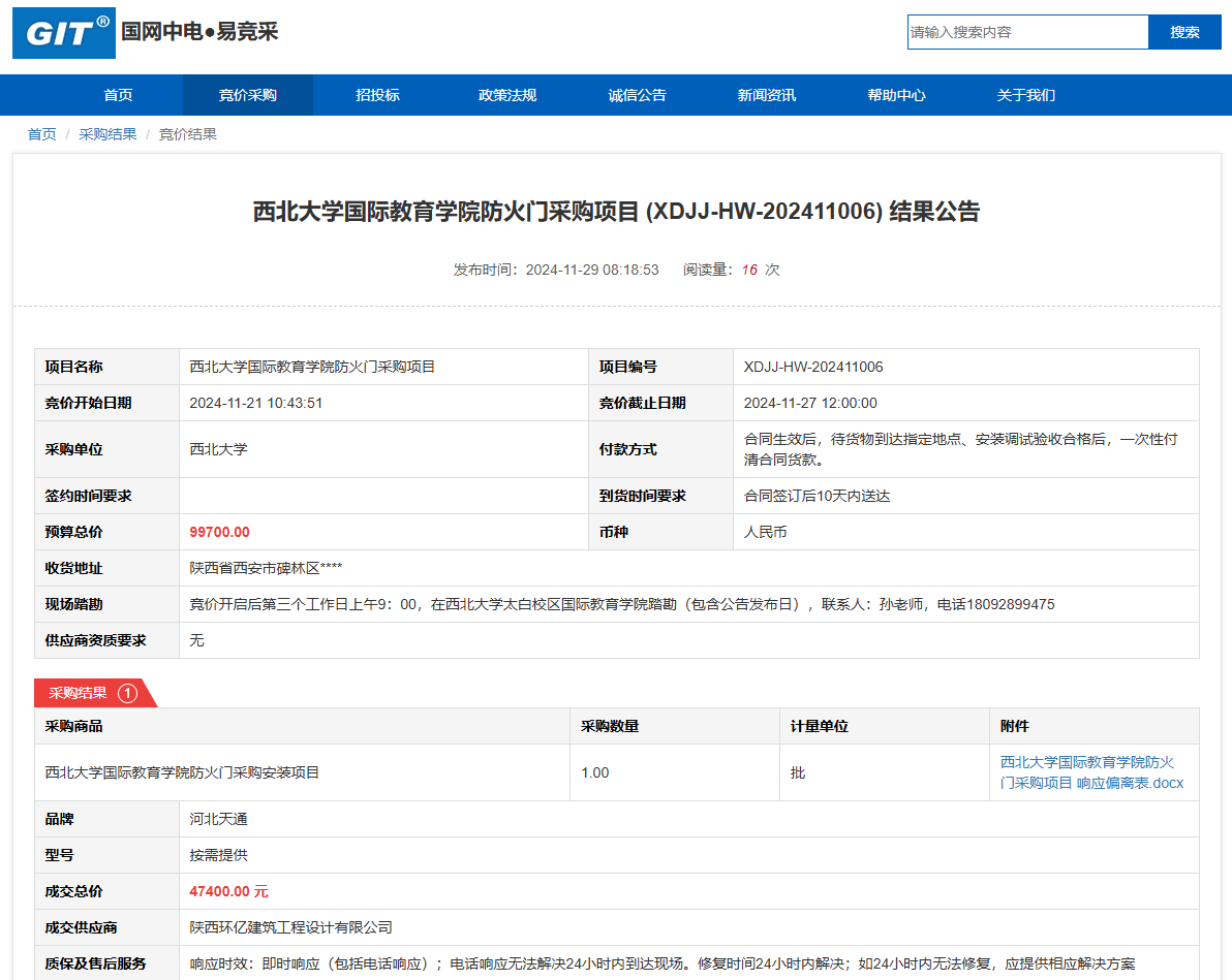 伟德国际1949始于英国国际教育学院防火门采购项目(XDJJ-HW-202411006)竞价结果公告 作者: 编辑: 时间:2024-11-29 原公告链接:https://www.ejingcai.com.cn/site/bidding/detail/15476