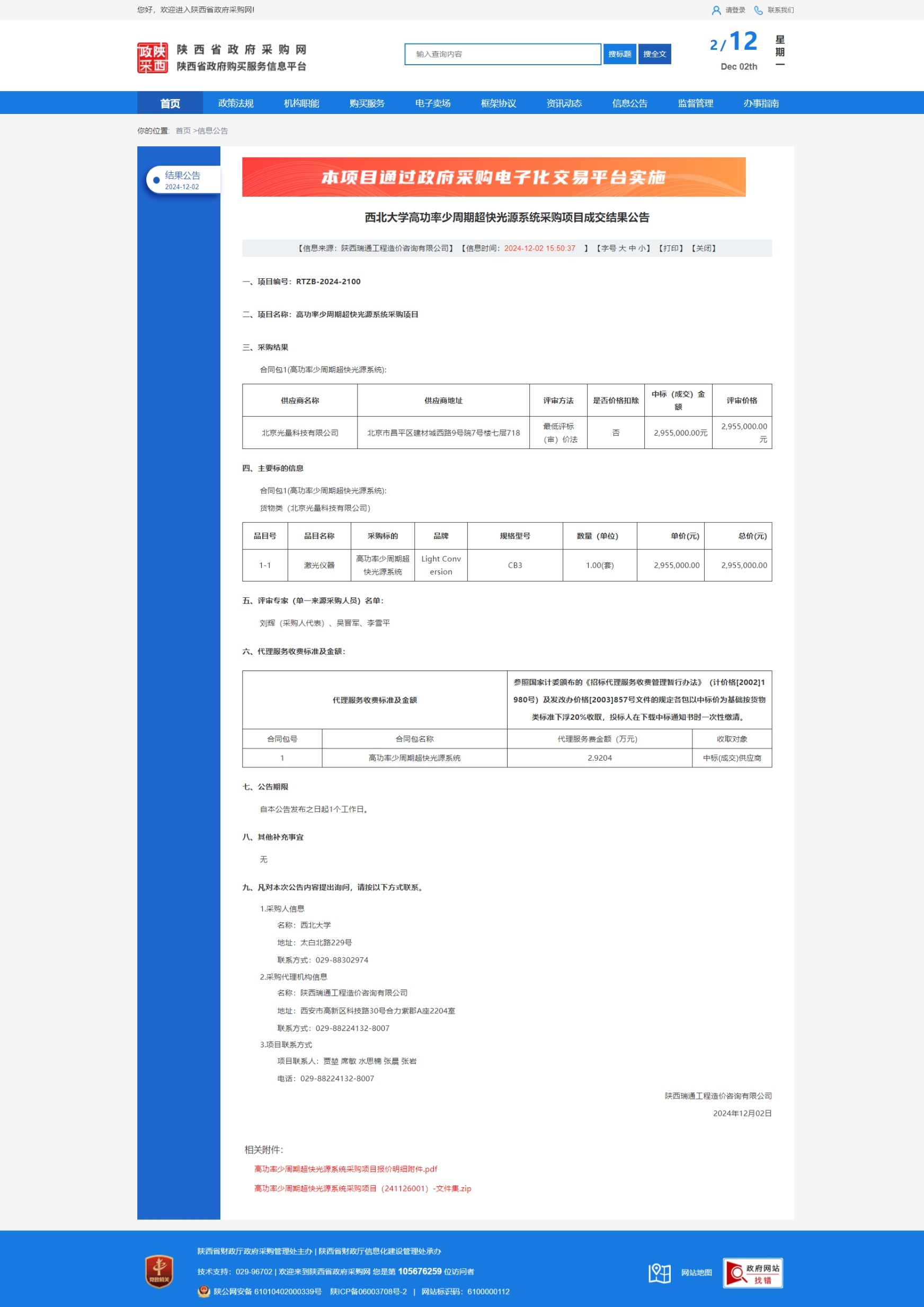 伟德国际1949始于英国高功率少周期超快光源系统采购项目成交结果公告 作者: 编辑:薛利娟 时间:2024-12-02 原公告链接:https://www.ccgp-shaanxi.gov.cn/freecms/site/shaanxi/ggxx/info/2024/8a69c2519218573701938649d42c03eb.html?noticeType=001025¬iceId=b85354c1-b083-11ef-8063-08c0eb20c666
