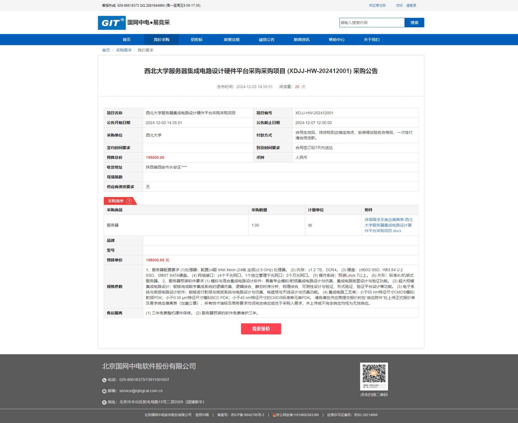 伟德国际1949始于英国服务器集成电路设计硬件平台采购采购项目 (XDJJ-HW-202412001) 竞价采购公告 作者: 编辑:薛利娟 时间:2024-12-03 原公告链接:https://www.ejingcai.com.cn/site/bidding/detail/15610