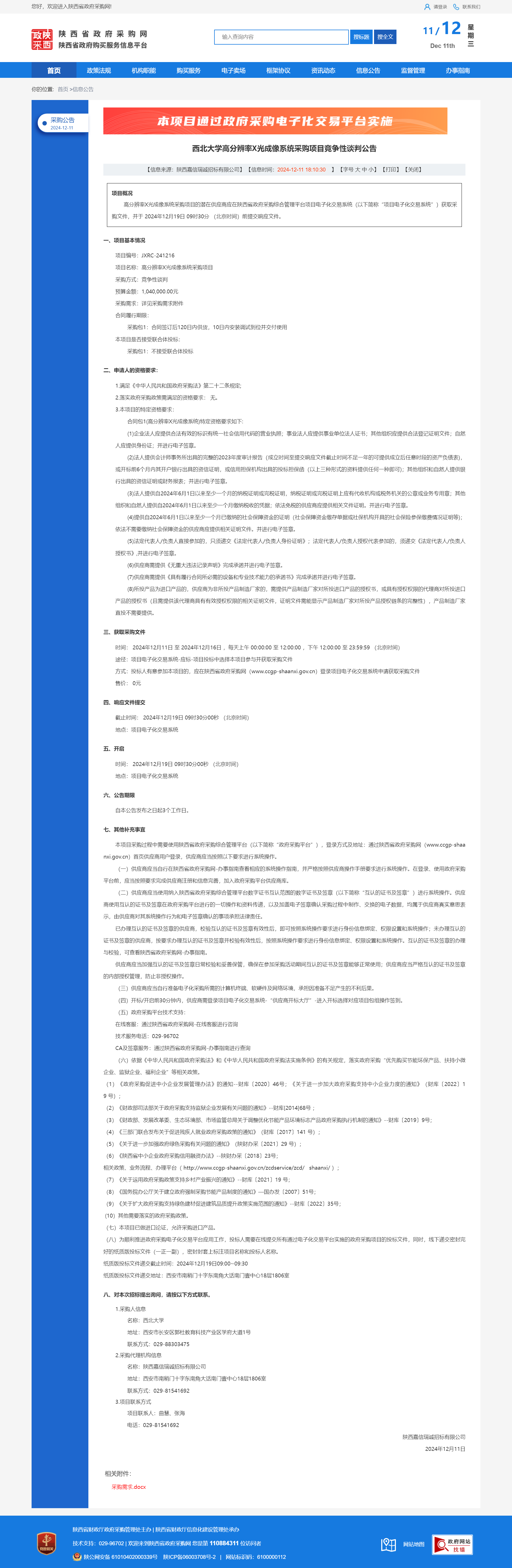 伟德国际1949始于英国高分辨率X光成像系统采购项目竞争性谈判公告 作者:采购与招标办公室 编辑: 时间:2024-12-11 原公告链接:https://www.ccgp-shaanxi.gov.cn/freecms/site/shaanxi/ggxx/info/2024/8a69c251921857370193b5010b9638d3.html?noticeType=001013¬iceId=c4fa68de-b7a9-11ef-8063-08c0eb20c666
