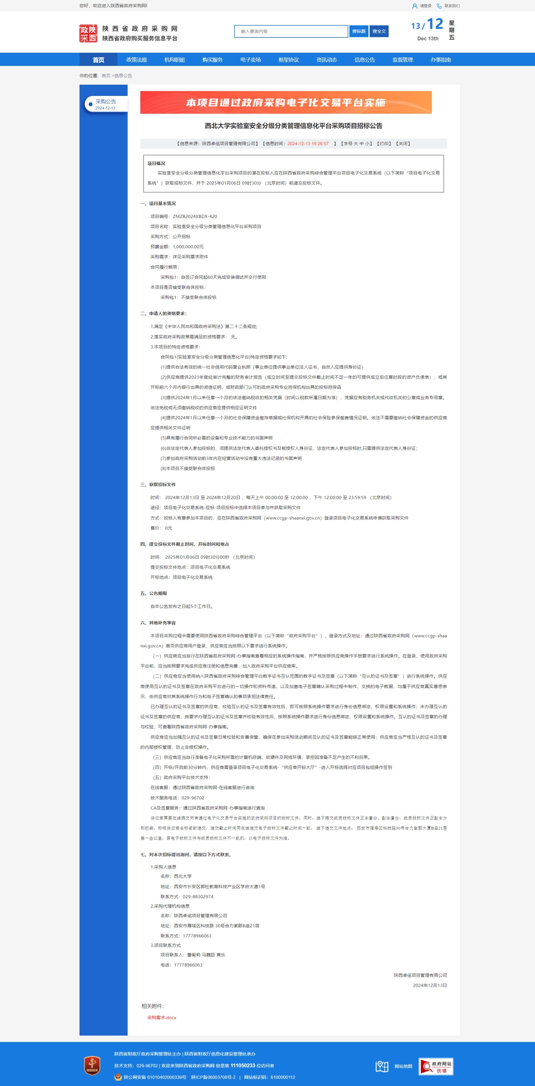 伟德国际1949始于英国实验室安全分级分类管理信息化平台采购项目招标公告 作者: 编辑:采购与招标办公室 时间:2024-12-13 原公告链接:https://www.ccgp-shaanxi.gov.cn/freecms/site/shaanxi/ggxx/info/2024/8a69c95d921859f00193bf116d567355.html?noticeType=001011¬iceId=a3767776-b92d-11ef-8063-08c0eb20c666