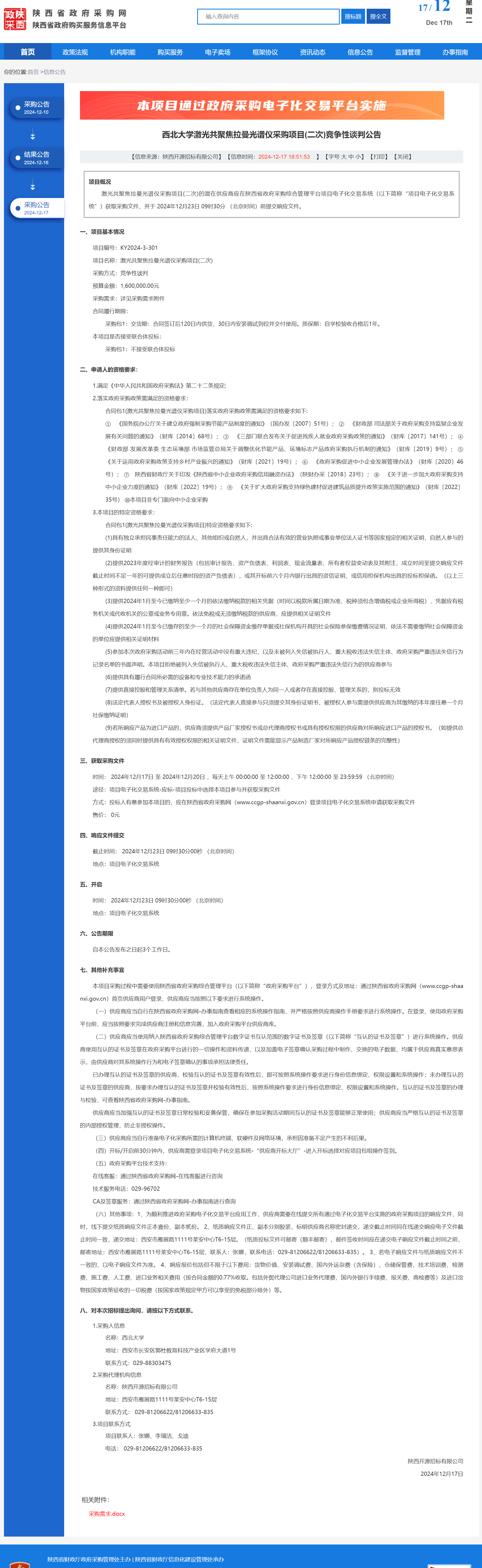 伟德国际1949始于英国激光共聚焦拉曼光谱仪采购项目(二次)竞争性谈判公告 作者:采购与招标办公室 编辑: 时间:2024-12-17 原公告链接:https://www.ccgp-shaanxi.gov.cn/freecms/site/shaanxi/ggxx/info/2024/8a69c44e9218572b0193d434f6c730a9.html?noticeType=001013¬iceId=8ed4237e-bc66-11ef-8063-08c0eb20c666