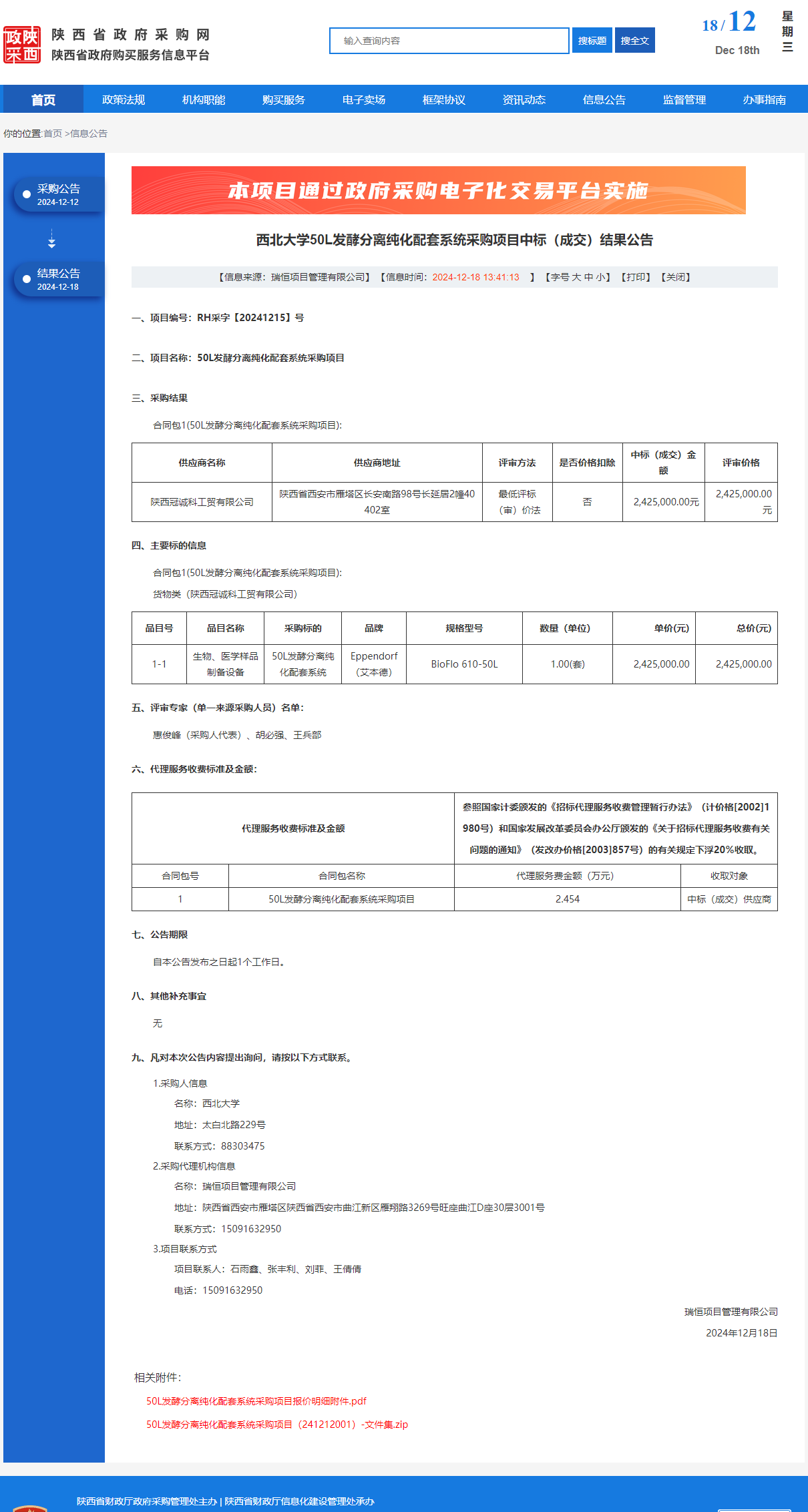 伟德国际1949始于英国50L发酵分离纯化配套系统采购项目中标(成交)结果公告 作者:采购与招标办公室 编辑: 时间:2024-12-18 原公告链接:https://www.ccgp-shaanxi.gov.cn/freecms/site/shaanxi/ggxx/info/2024/8a69c5a59218576d0193d83e10003654.html