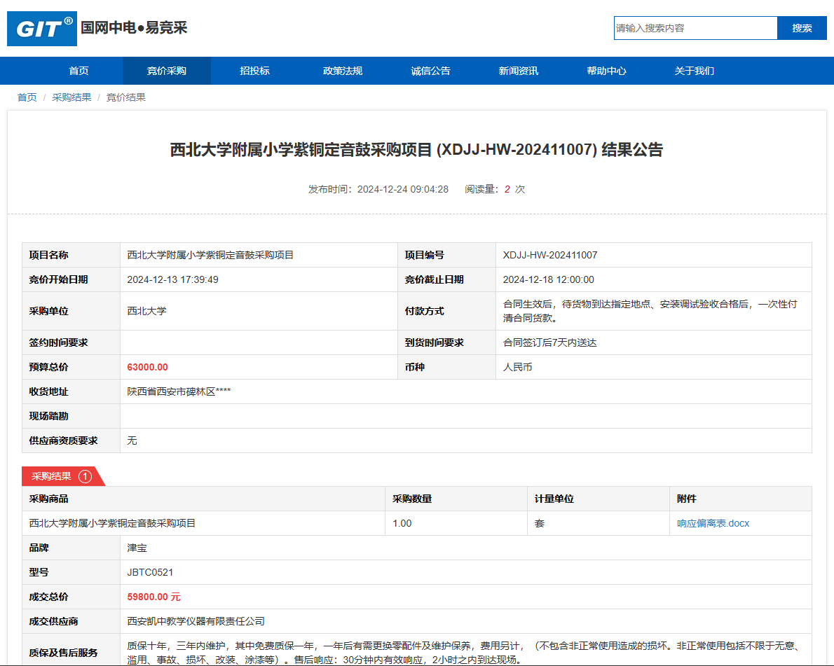 伟德国际1949始于英国附属小学紫铜定音鼓采购项目(XDJJ-HW-202411007)竞价结果公告 作者:采购与招标办公室 编辑: 时间:2024-12-24 原公告链接:https://www.ejingcai.com.cn/site/bidding/detail/16145