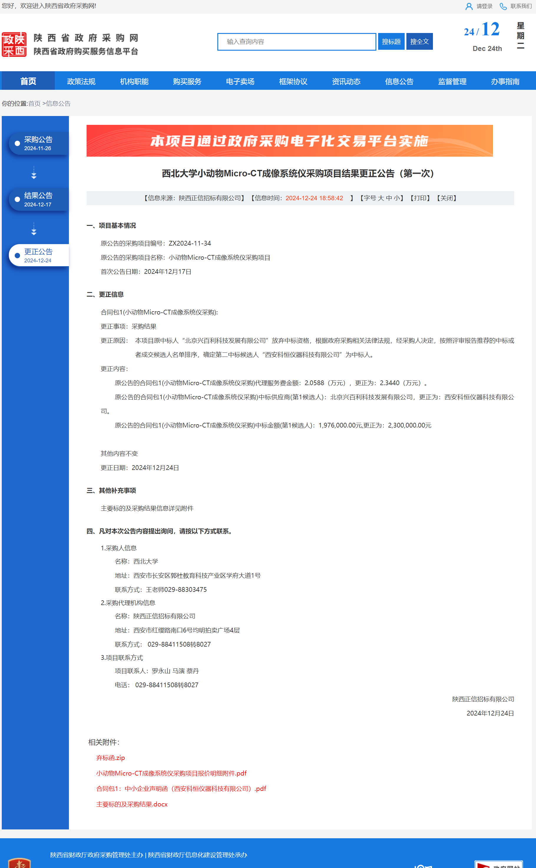 伟德国际1949始于英国小动物Micro-CT成像系统仪采购项目结果更正公告(第一次) 作者:采购与招标办公室 编辑: 时间:2024-12-24 原公告链接:https://www.ccgp-shaanxi.gov.cn/freecms/site/shaanxi/ggxx/info/2024/8a69c251921857370193f82a5d426362.html?noticeType=001032¬iceId=aebd6ced-c1e7-11ef-8063-08c0eb20c666