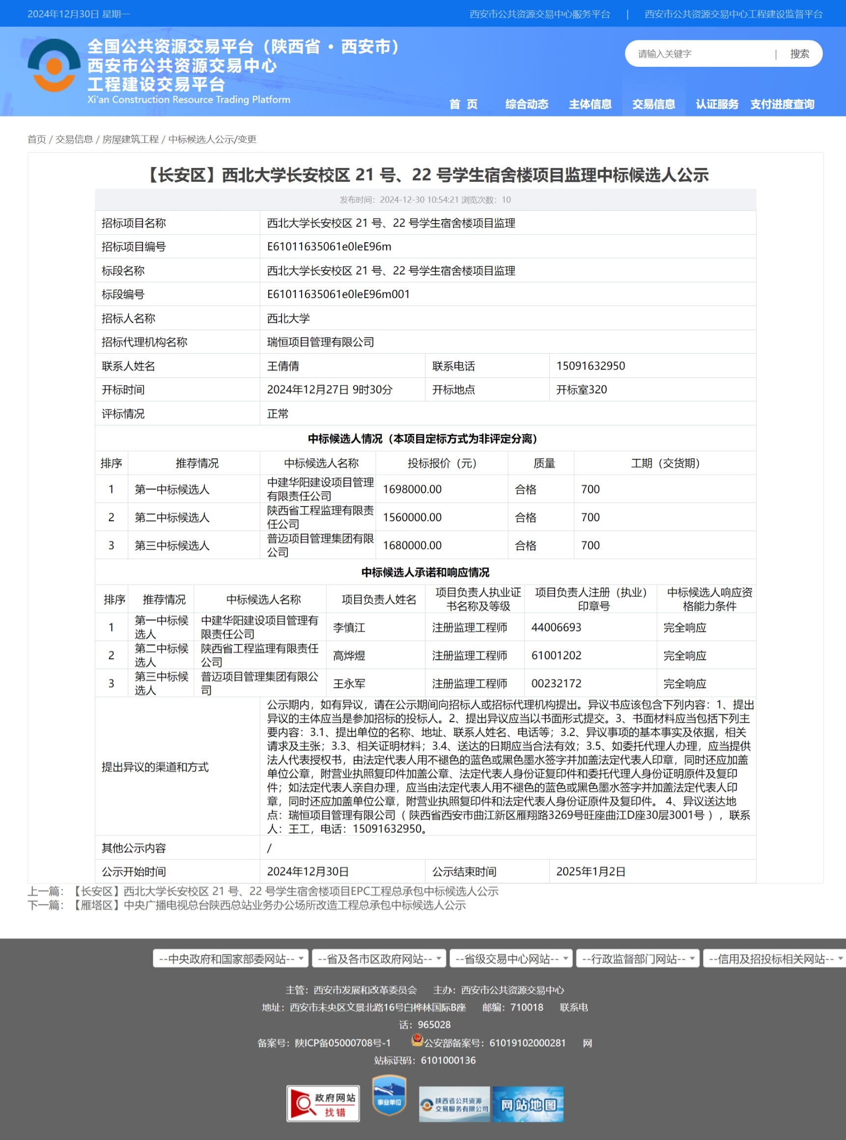 伟德国际1949始于英国长安校区 21 号、22 号学生宿舍楼项目监理中标候选人公示