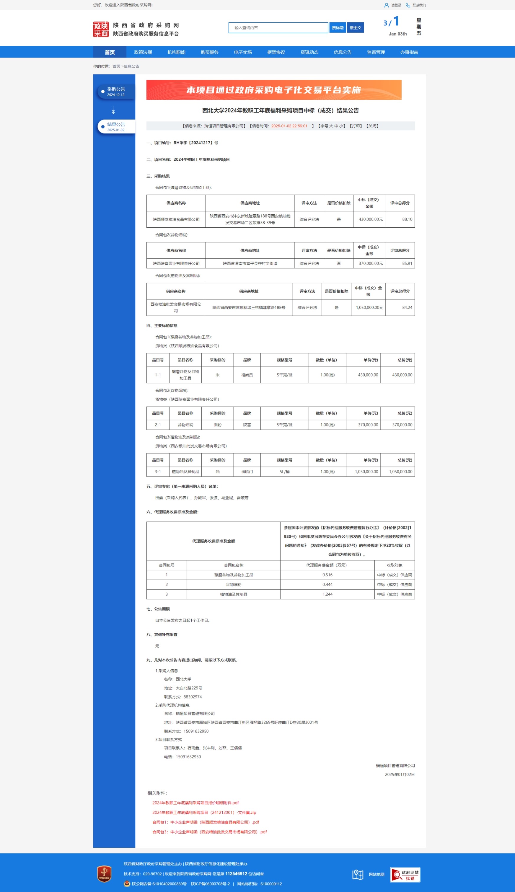 伟德国际1949始于英国2024年教职工年底福利采购项目中标(成交)结果公告 作者: 编辑:薛利娟 时间:2025-01-03 原公告链接:https://www.ccgp-shaanxi.gov.cn/freecms/site/shaanxi/ggxx/info/2025/8a69c95d921859f001942760b68b1aa7.html?noticeType=001021¬iceId=57f4954f-c91b-11ef-8063-08c0eb20c666