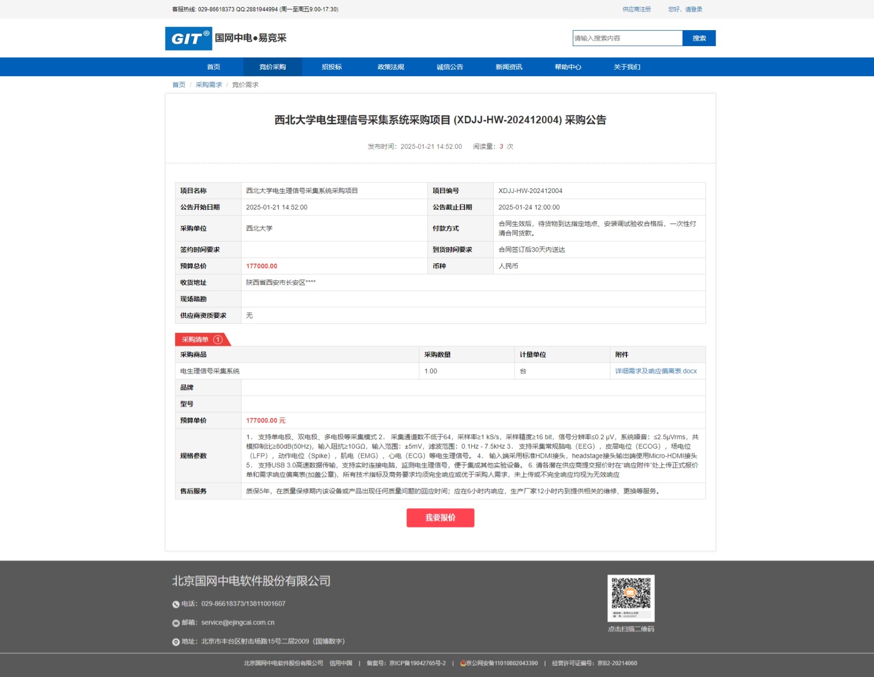 伟德国际1949始于英国电生理信号采集系统采购项目 (XDJJ-HW-202412004) 竞价采购公告 作者: 编辑: 时间:2025-01-21 原公告链接:https://www.ejingcai.com.cn/site/bidding/detail/16443