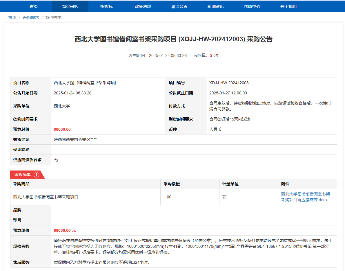 伟德国际1949始于英国图书馆借阅室书架采购项目 (XDJJ-HW-202412003) 采购公告 作者:采购与招标办公室 编辑: 时间:2025-01-24 原公告链接:https://www.ejingcai.com.cn/site/bidding/detail/16453