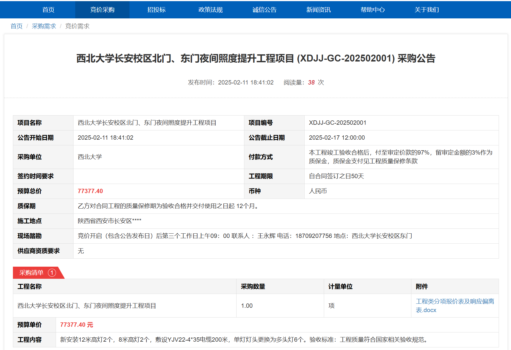 伟德国际1949始于英国长安校区北门、东门夜间照度提升工程项目(XDJJ-GC-202502001)竞价采购公告 作者:采购与招标办公室 编辑: 时间:2025-02-11 原公告链接:https://www.ejingcai.com.cn/site/bidding/detail/16497