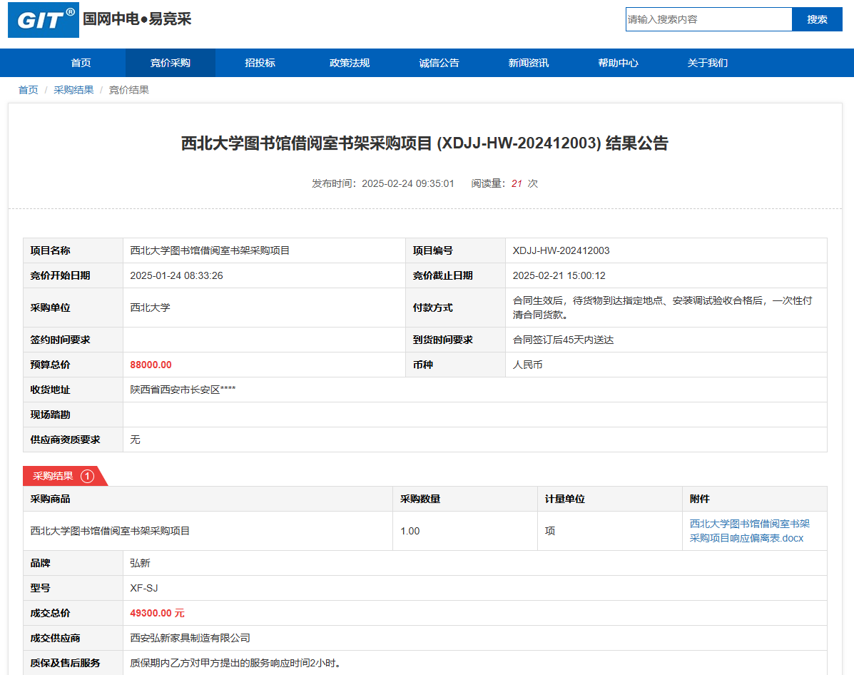 伟德国际1949始于英国图书馆借阅室书架采购项目(XDJJ-HW-202412003)竞价结果公告 作者:采购与招标办公室 编辑: 时间:2025-02-24 原公告链接:https://www.ejingcai.com.cn/site/bidding/detail/16596