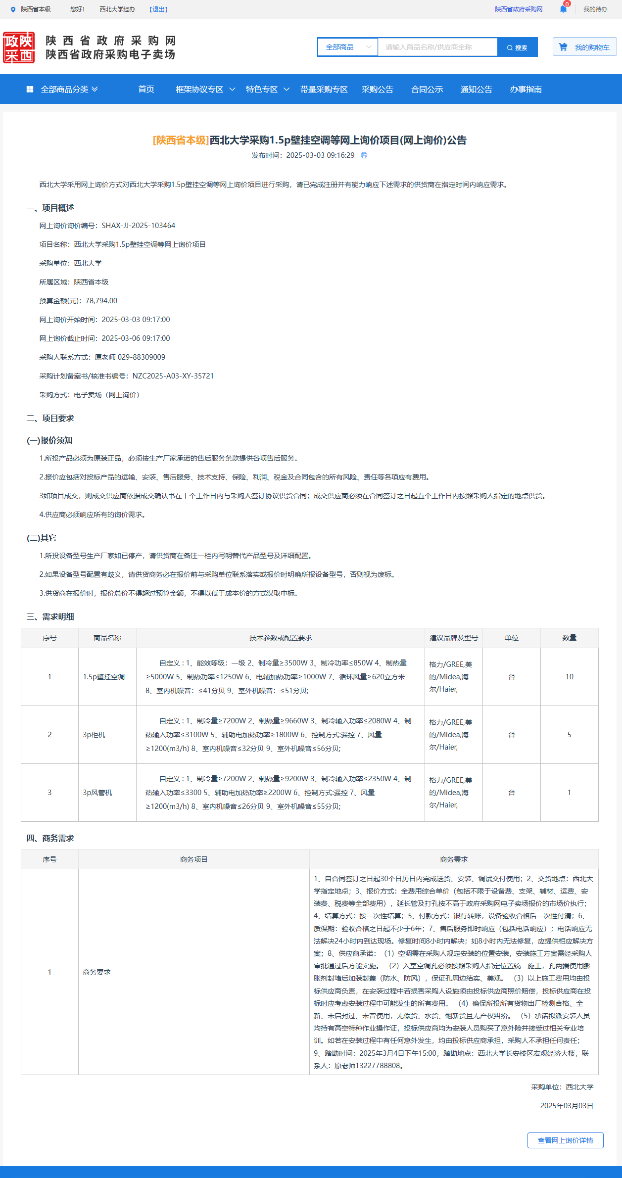 伟德国际1949始于英国采购1.5p壁挂空调等网上询价项目(网上询价)公告 作者:采购与招标办公室 编辑: 时间:2025-03-03 原公告链接:https://www.ccgp-shaanxi.gov.cn/gpmall-main-web/basic/noticeDetail?noticeGuid=7295516810999431168