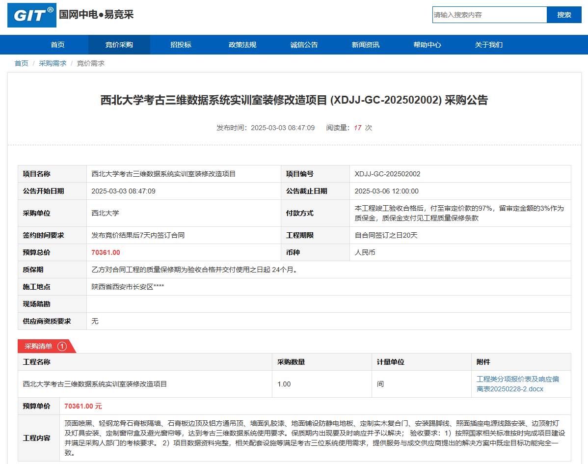 伟德国际1949始于英国考古三维数据系统实训室装修改造项目(XDJJ-GC-202502002)竞价采购公告 作者:采购与招标办公室 编辑: 时间:2025-03-03 原公告链接:https://www.ejingcai.com.cn/site/bidding/detail/16671
